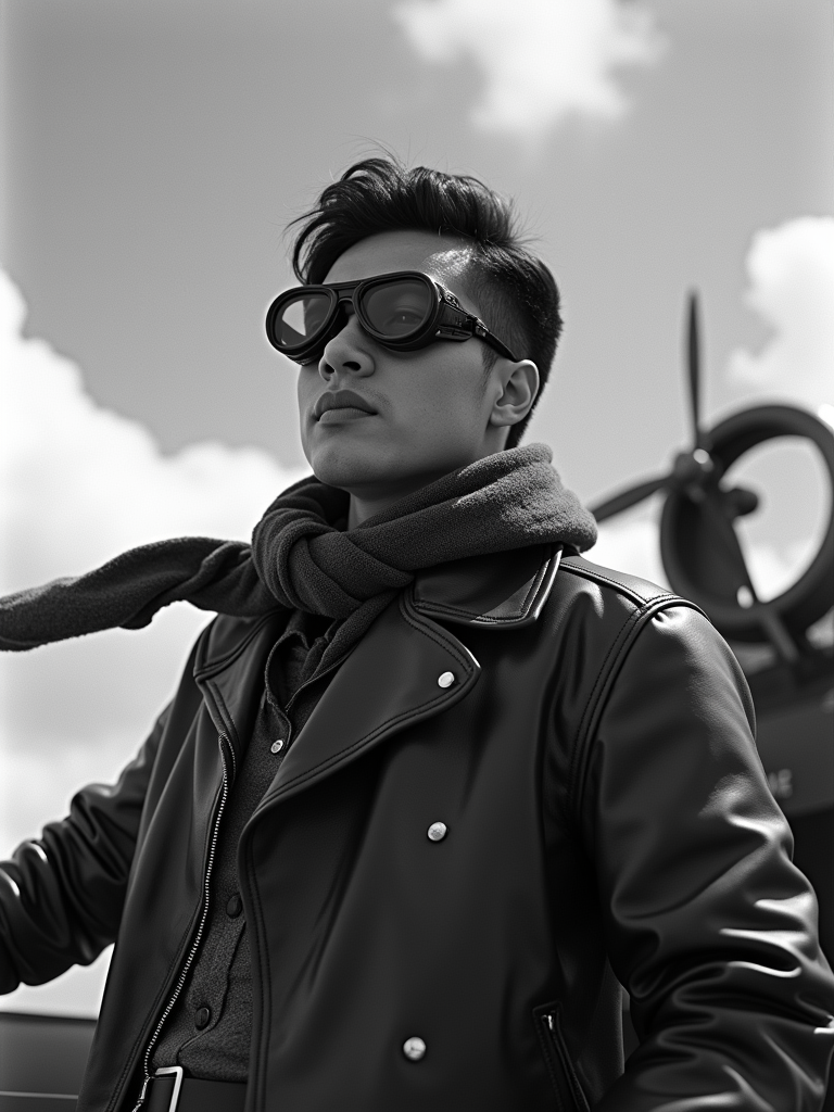 black and white 35mm film of model as a 1920s silent film aviator wearing leather flight jacket and goggles, dramatic wind-blown scarf, triumphant expression, airplane propeller visible in frame, high-contrast black and white, cloudy sky backdrop