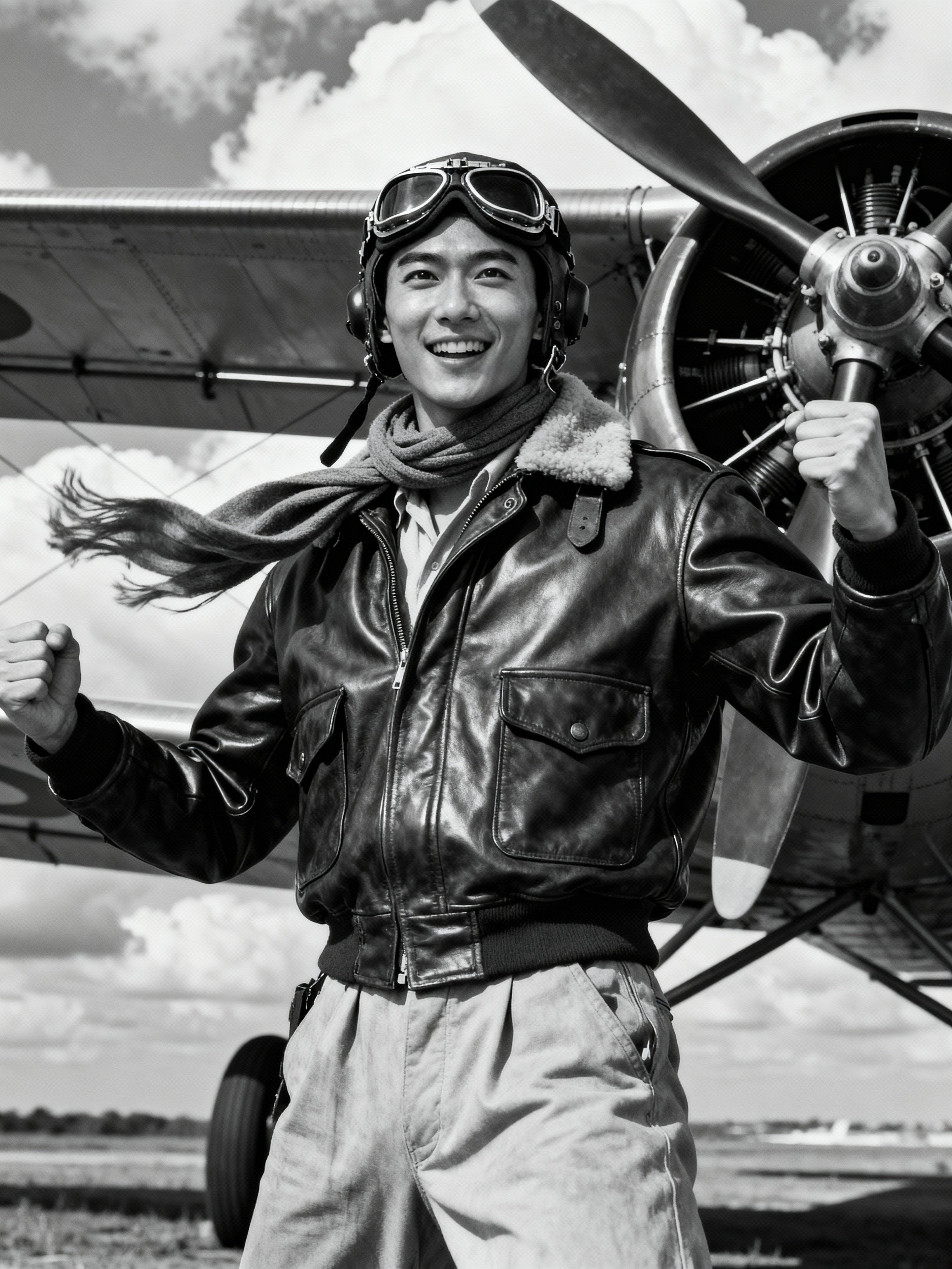 black and white 35mm film of model as a 1920s silent film aviator wearing leather flight jacket and goggles, dramatic wind-blown scarf, triumphant expression, airplane propeller visible in frame, high-contrast black and white, cloudy sky backdrop