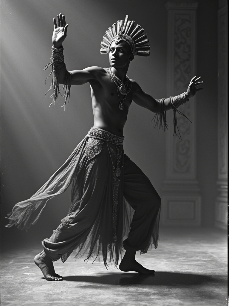 black and white 35mm film of model as a 1920s silent film exotic prince in ornate costume, performing a ceremonial dance, exaggerated graceful pose, theatrical lighting, black and white with vintage film scratches, elaborate temple set design
