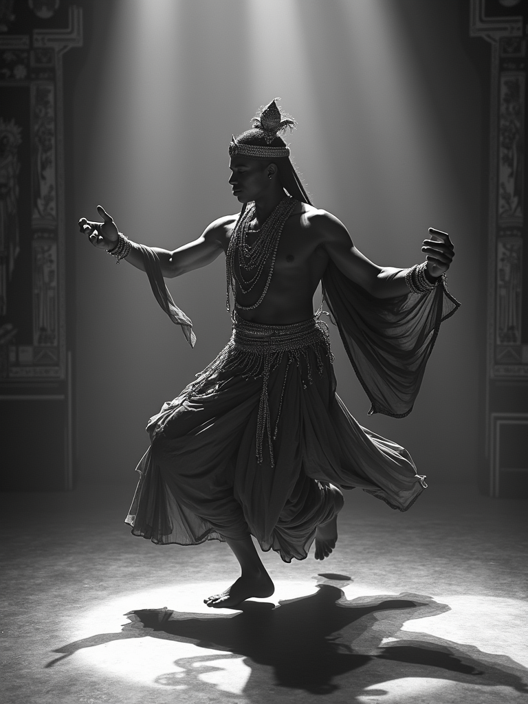 black and white 35mm film of model as a 1920s silent film exotic prince in ornate costume, performing a ceremonial dance, exaggerated graceful pose, theatrical lighting, black and white with vintage film scratches, elaborate temple set design
