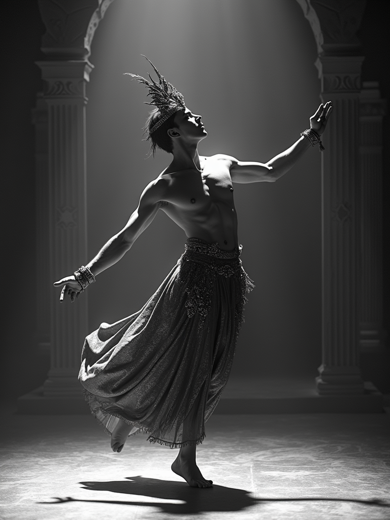 black and white 35mm film of model as a 1920s silent film exotic prince in ornate costume, performing a ceremonial dance, exaggerated graceful pose, theatrical lighting, black and white with vintage film scratches, elaborate temple set design