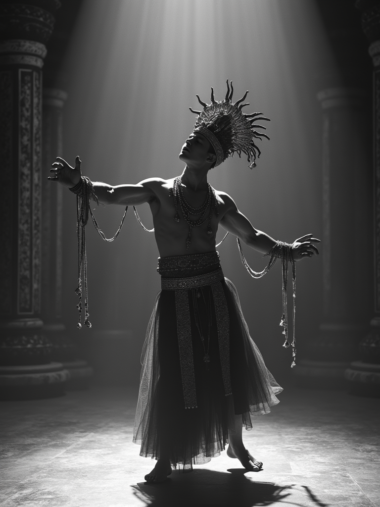 black and white 35mm film of model as a 1920s silent film exotic prince in ornate costume, performing a ceremonial dance, exaggerated graceful pose, theatrical lighting, black and white with vintage film scratches, elaborate temple set design