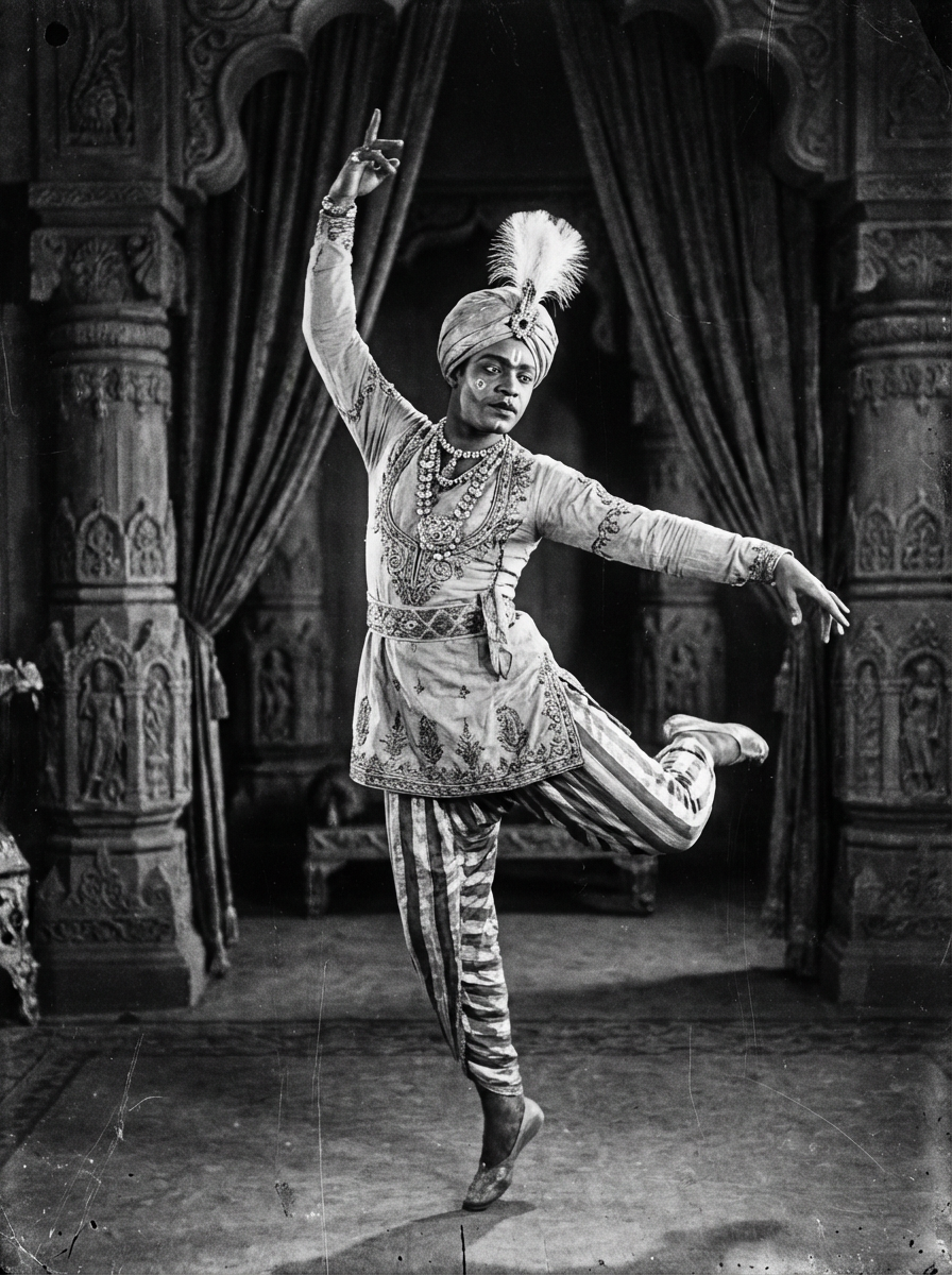 black and white 35mm film of model as a 1920s silent film exotic prince in ornate costume, performing a ceremonial dance, exaggerated graceful pose, theatrical lighting, black and white with vintage film scratches, elaborate temple set design