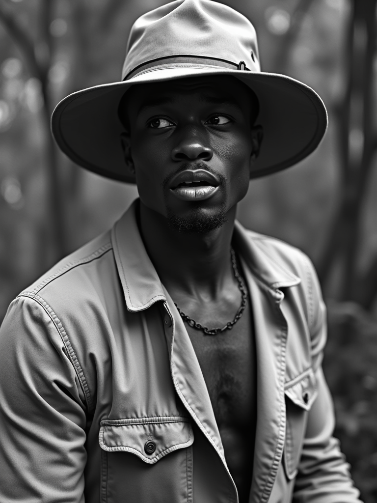 black and white 35mm film of model as a 1920s silent film explorer in the style of early serials, wearing khaki explorer clothes with pith helmet, dramatic surprised expression, action pose, high-contrast black and white, jungle set with prop dangers