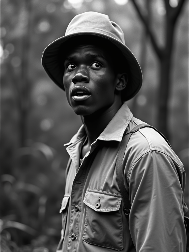 black and white 35mm film of model as a 1920s silent film explorer in the style of early serials, wearing khaki explorer clothes with pith helmet, dramatic surprised expression, action pose, high-contrast black and white, jungle set with prop dangers