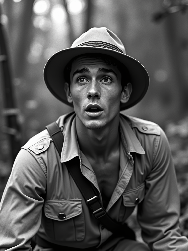 black and white 35mm film of model as a 1920s silent film explorer in the style of early serials, wearing khaki explorer clothes with pith helmet, dramatic surprised expression, action pose, high-contrast black and white, jungle set with prop dangers