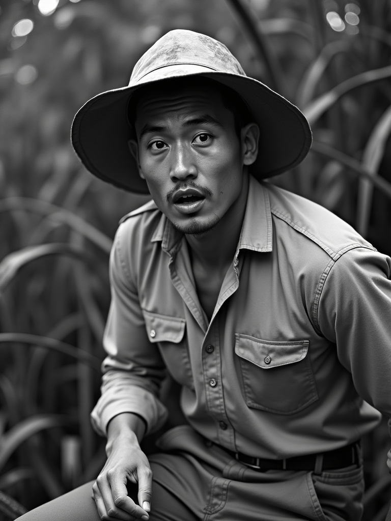 black and white 35mm film of model as a 1920s silent film explorer in the style of early serials, wearing khaki explorer clothes with pith helmet, dramatic surprised expression, action pose, high-contrast black and white, jungle set with prop dangers