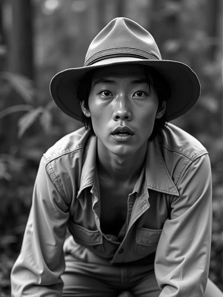 black and white 35mm film of model as a 1920s silent film explorer in the style of early serials, wearing khaki explorer clothes with pith helmet, dramatic surprised expression, action pose, high-contrast black and white, jungle set with prop dangers