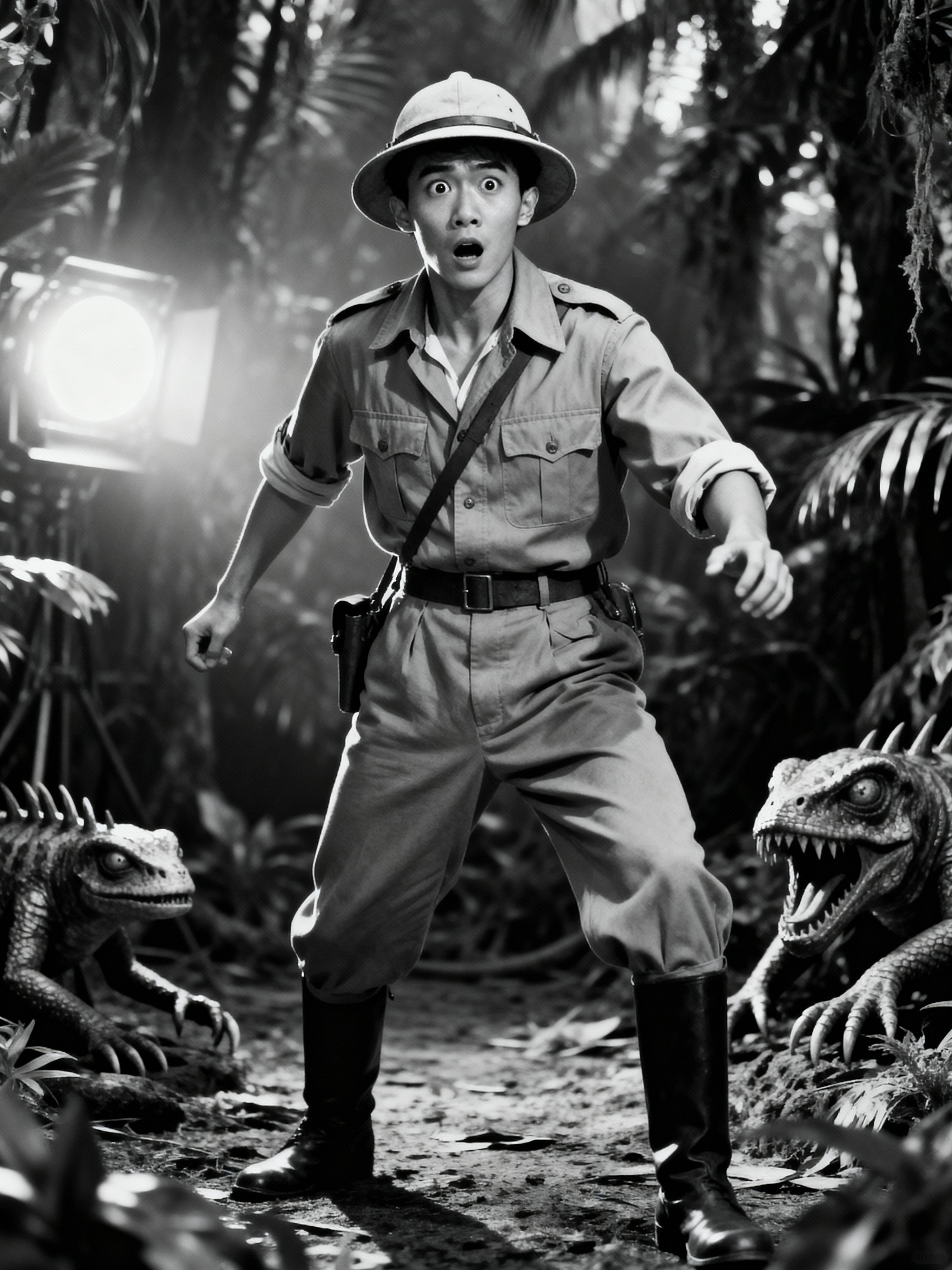 black and white 35mm film of model as a 1920s silent film explorer in the style of early serials, wearing khaki explorer clothes with pith helmet, dramatic surprised expression, action pose, high-contrast black and white, jungle set with prop dangers