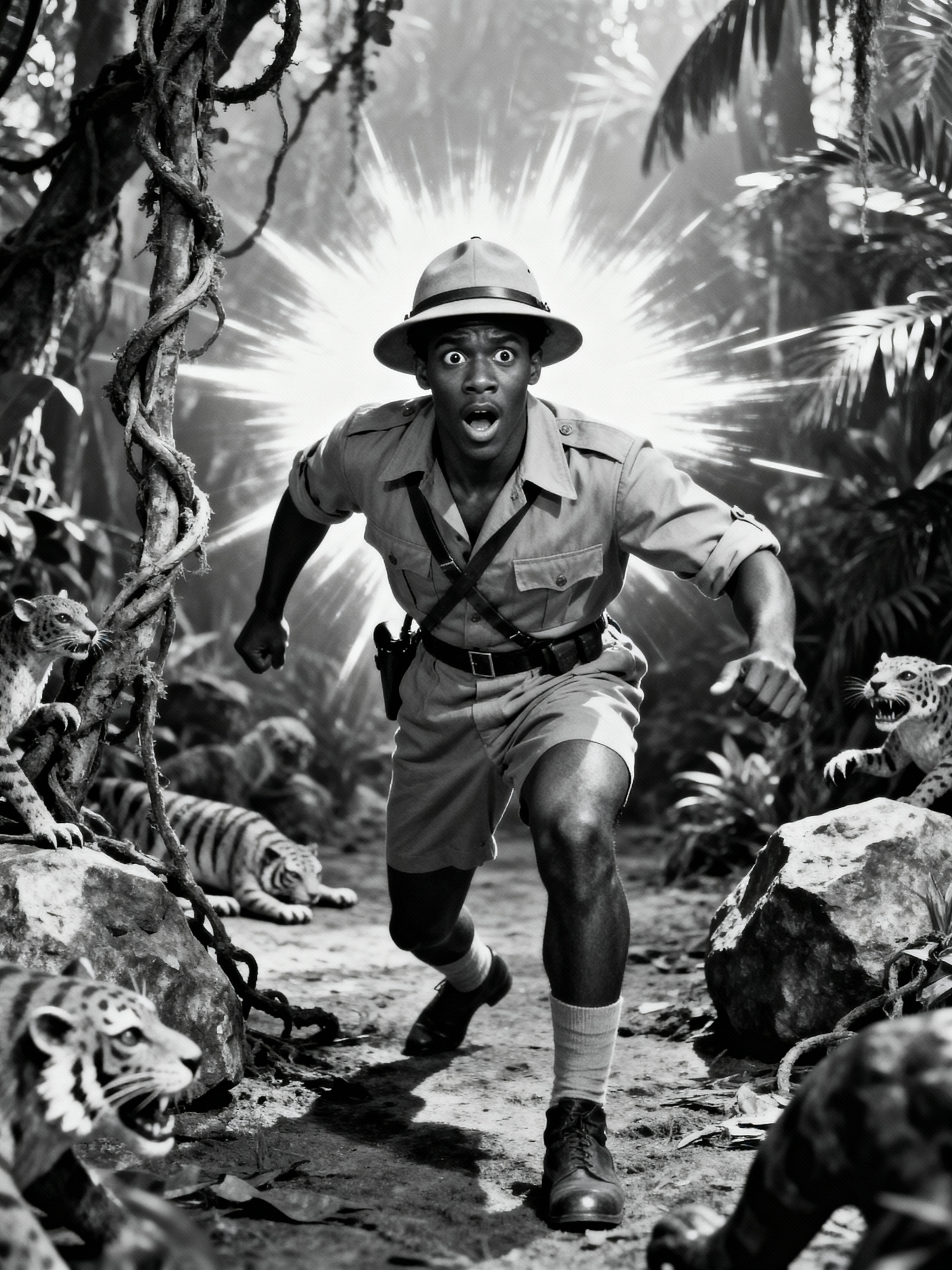 black and white 35mm film of model as a 1920s silent film explorer in the style of early serials, wearing khaki explorer clothes with pith helmet, dramatic surprised expression, action pose, high-contrast black and white, jungle set with prop dangers