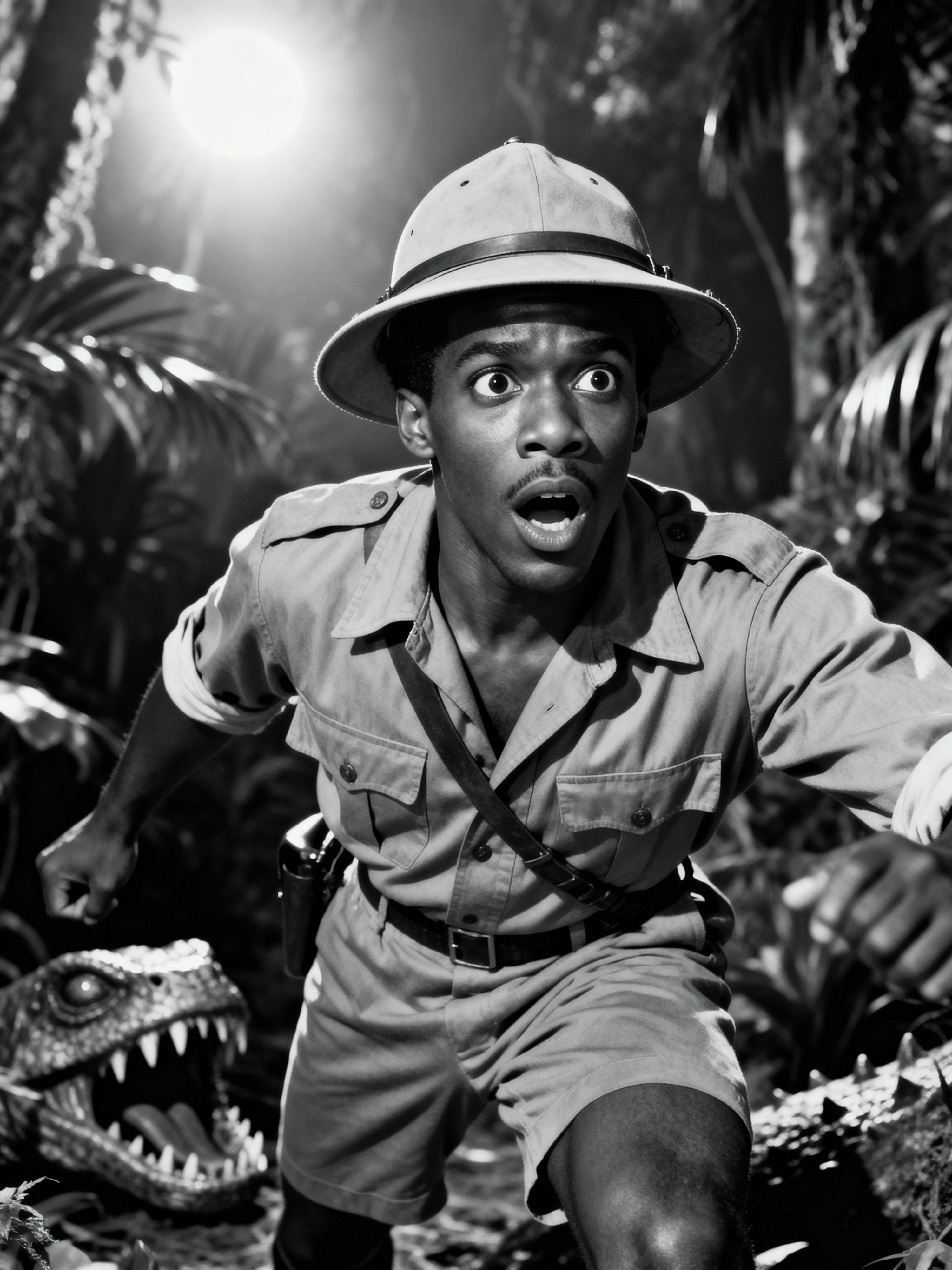 black and white 35mm film of model as a 1920s silent film explorer in the style of early serials, wearing khaki explorer clothes with pith helmet, dramatic surprised expression, action pose, high-contrast black and white, jungle set with prop dangers