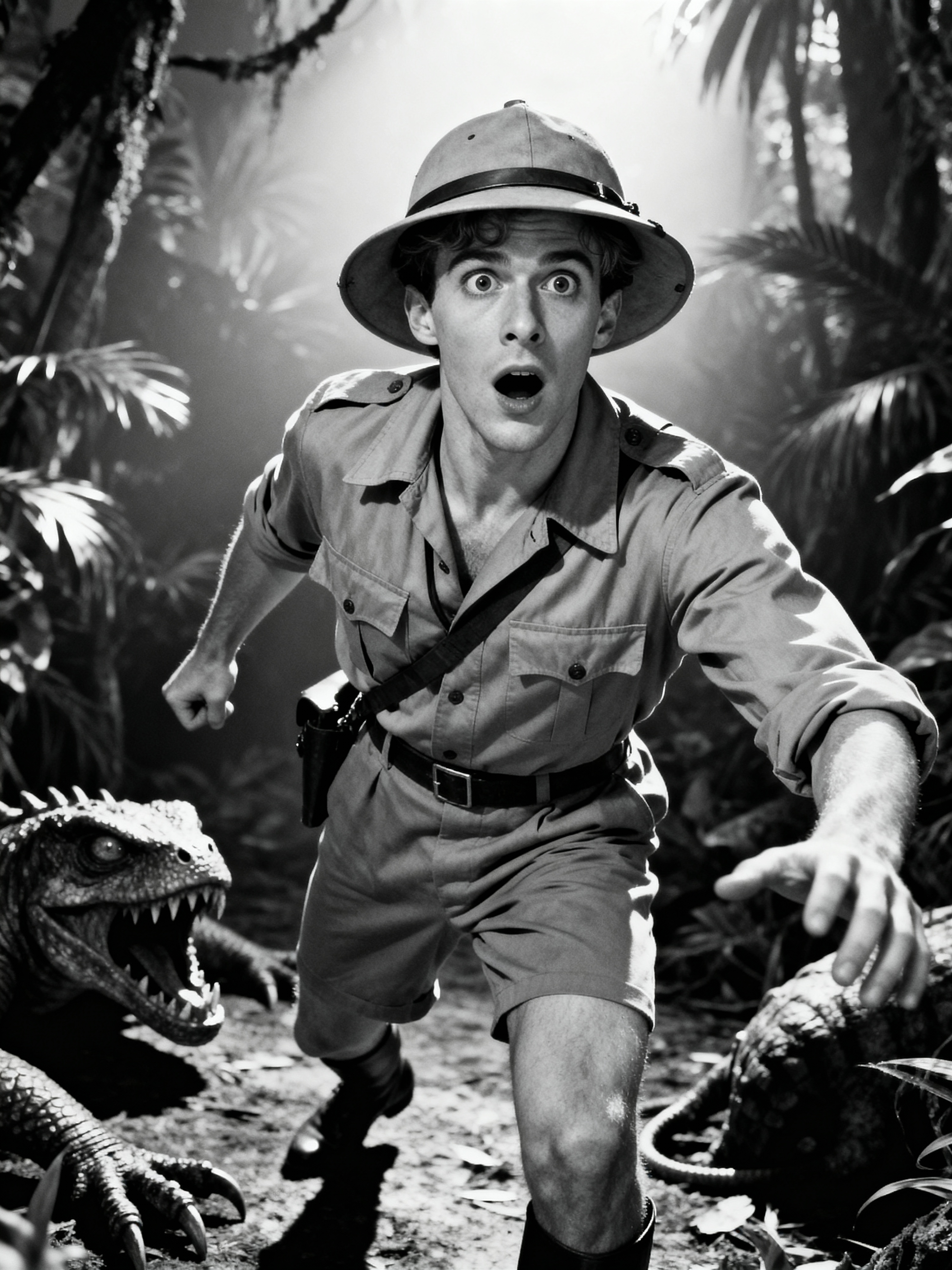 black and white 35mm film of model as a 1920s silent film explorer in the style of early serials, wearing khaki explorer clothes with pith helmet, dramatic surprised expression, action pose, high-contrast black and white, jungle set with prop dangers