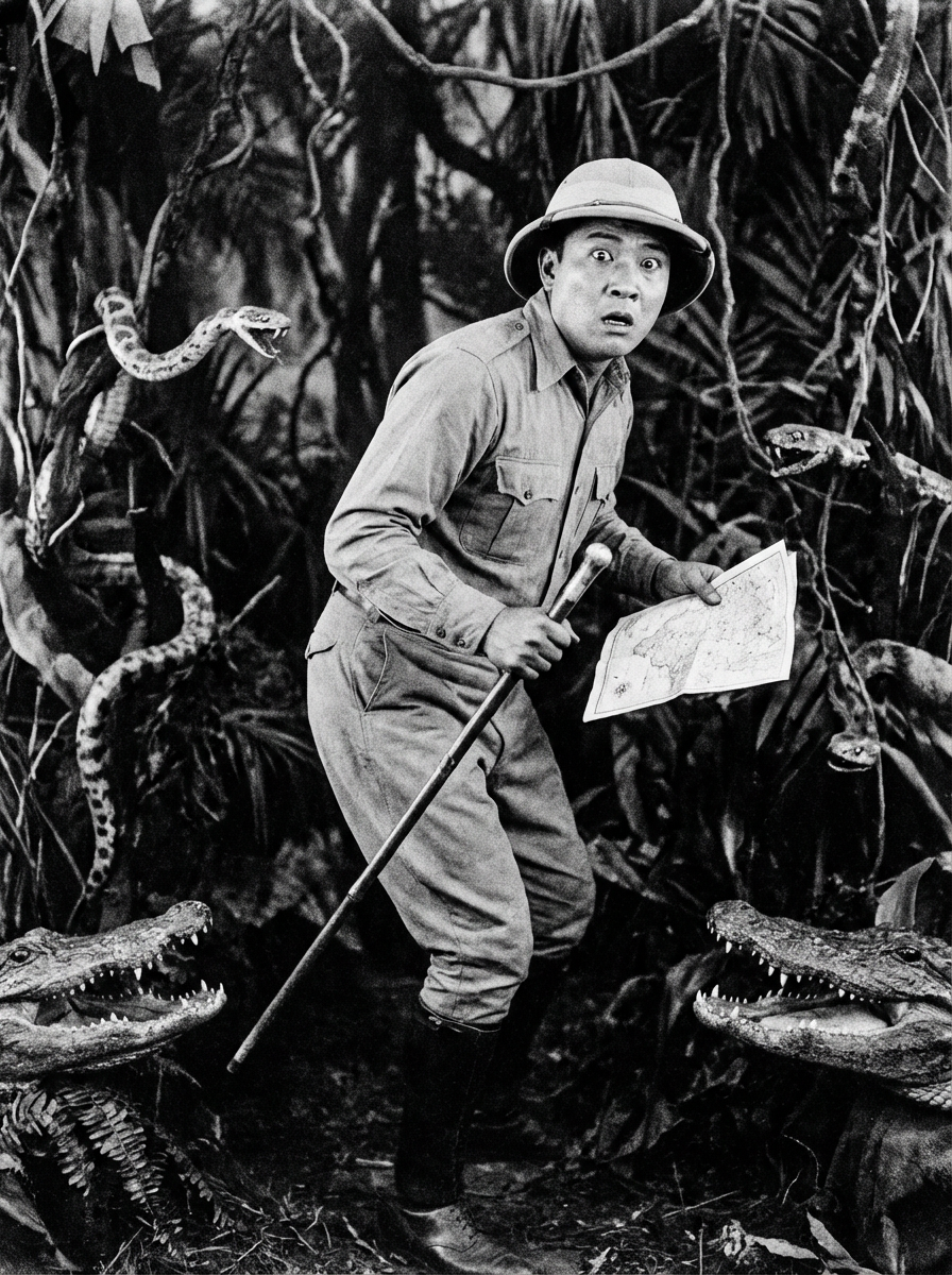 black and white 35mm film of model as a 1920s silent film explorer in the style of early serials, wearing khaki explorer clothes with pith helmet, dramatic surprised expression, action pose, high-contrast black and white, jungle set with prop dangers