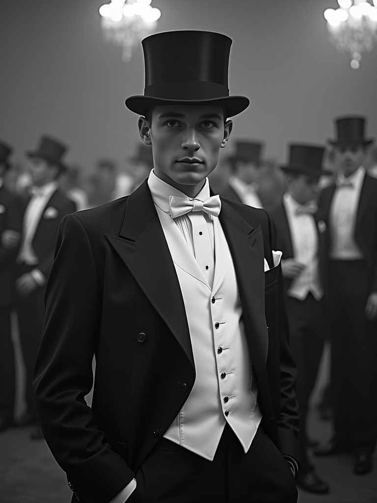 black and white 35mm film of model as a 1920s silent film gentleman at a grand ball, wearing a white tie formal suit with top hat, exaggerated haughty expression, theatrical pose, black and white with iris vignette effect, ballroom setting
