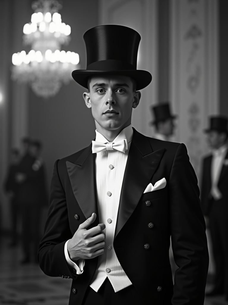 black and white 35mm film of model as a 1920s silent film gentleman at a grand ball, wearing a white tie formal suit with top hat, exaggerated haughty expression, theatrical pose, black and white with iris vignette effect, ballroom setting