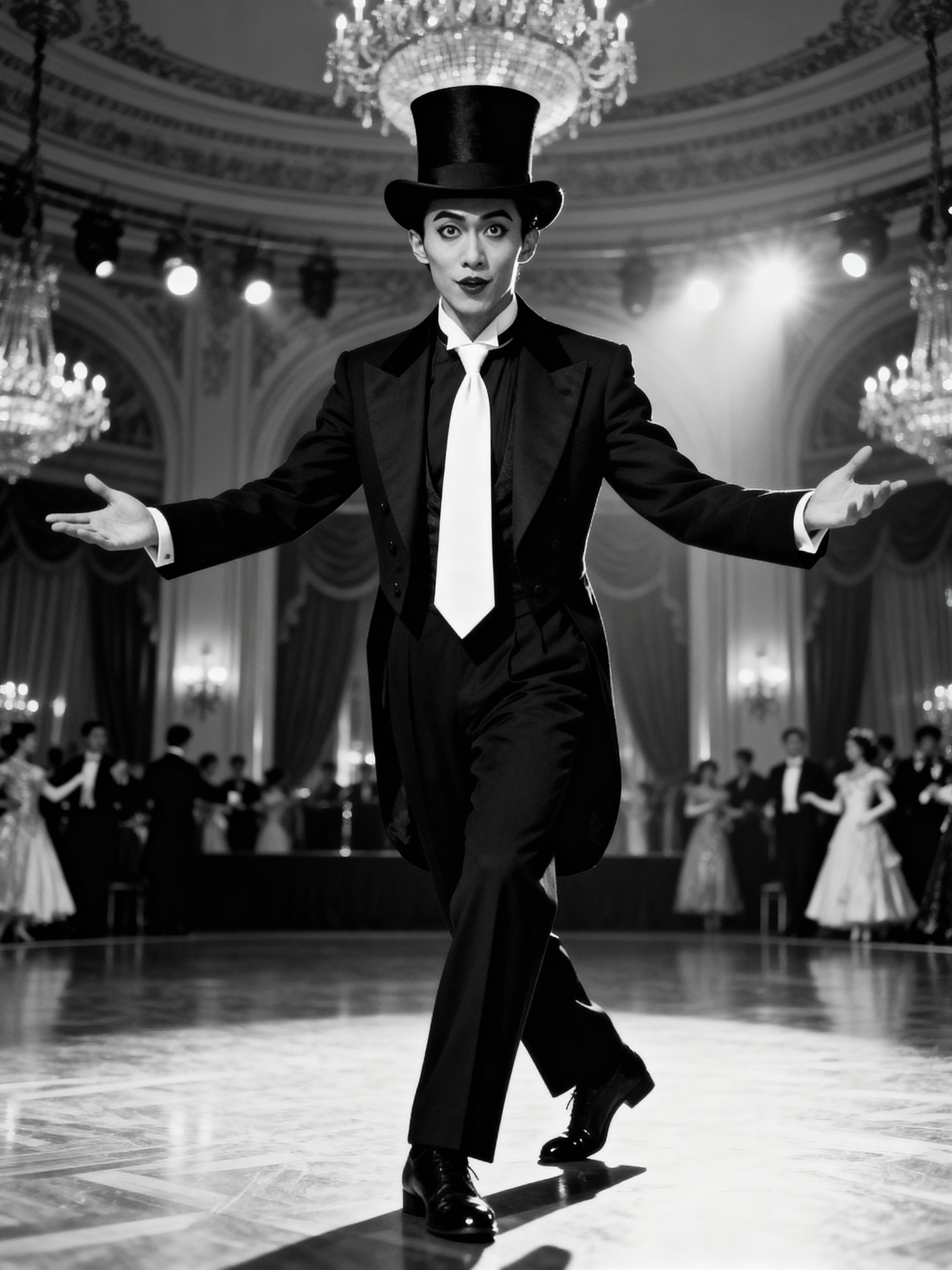 black and white 35mm film of model as a 1920s silent film gentleman at a grand ball, wearing a white tie formal suit with top hat, exaggerated haughty expression, theatrical pose, black and white with iris vignette effect, ballroom setting