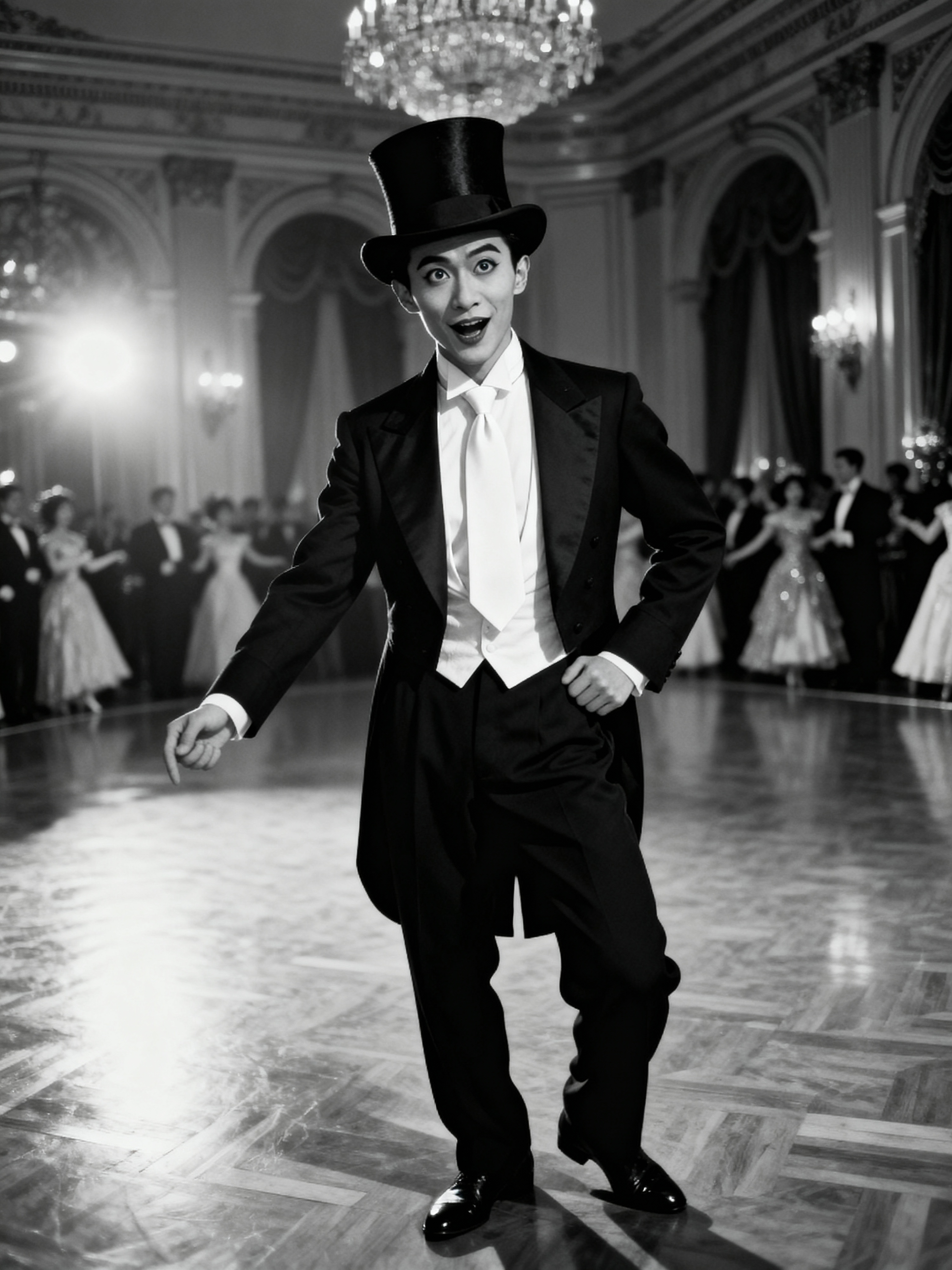 black and white 35mm film of model as a 1920s silent film gentleman at a grand ball, wearing a white tie formal suit with top hat, exaggerated haughty expression, theatrical pose, black and white with iris vignette effect, ballroom setting