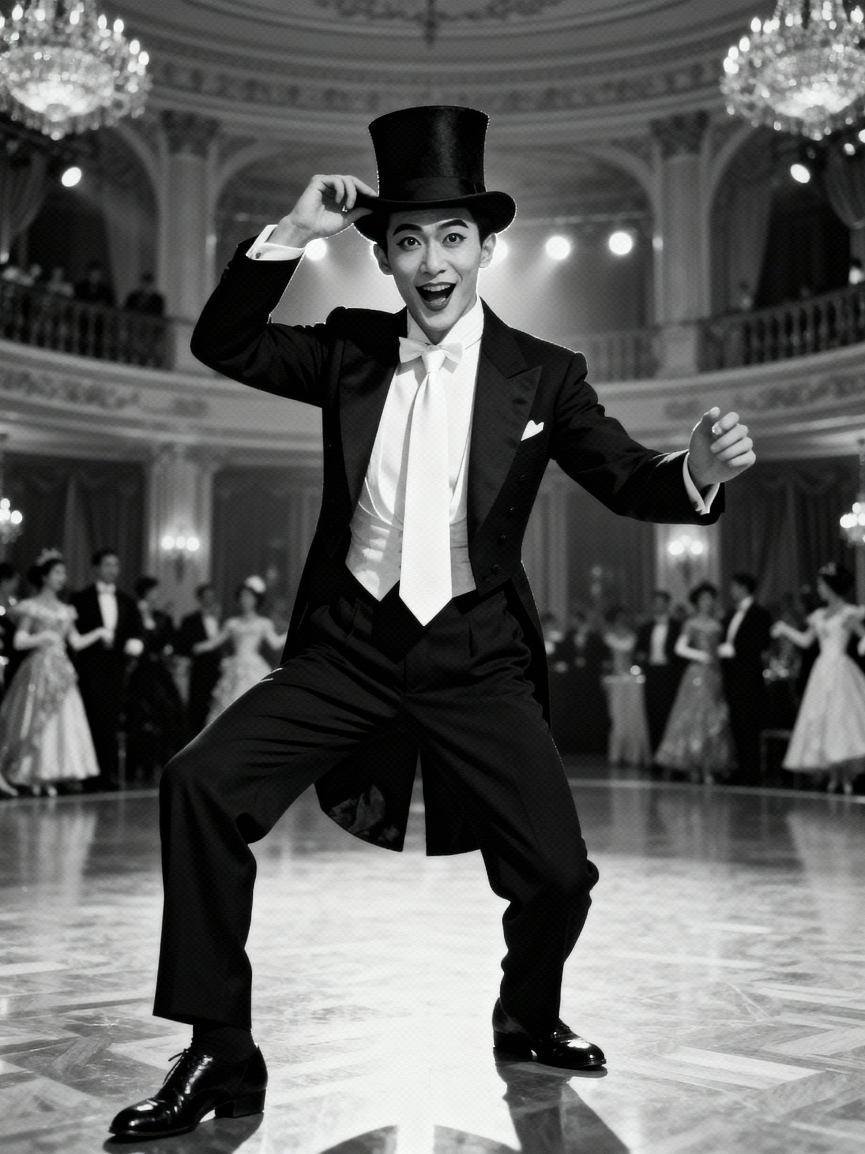 black and white 35mm film of model as a 1920s silent film gentleman at a grand ball, wearing a white tie formal suit with top hat, exaggerated haughty expression, theatrical pose, black and white with iris vignette effect, ballroom setting