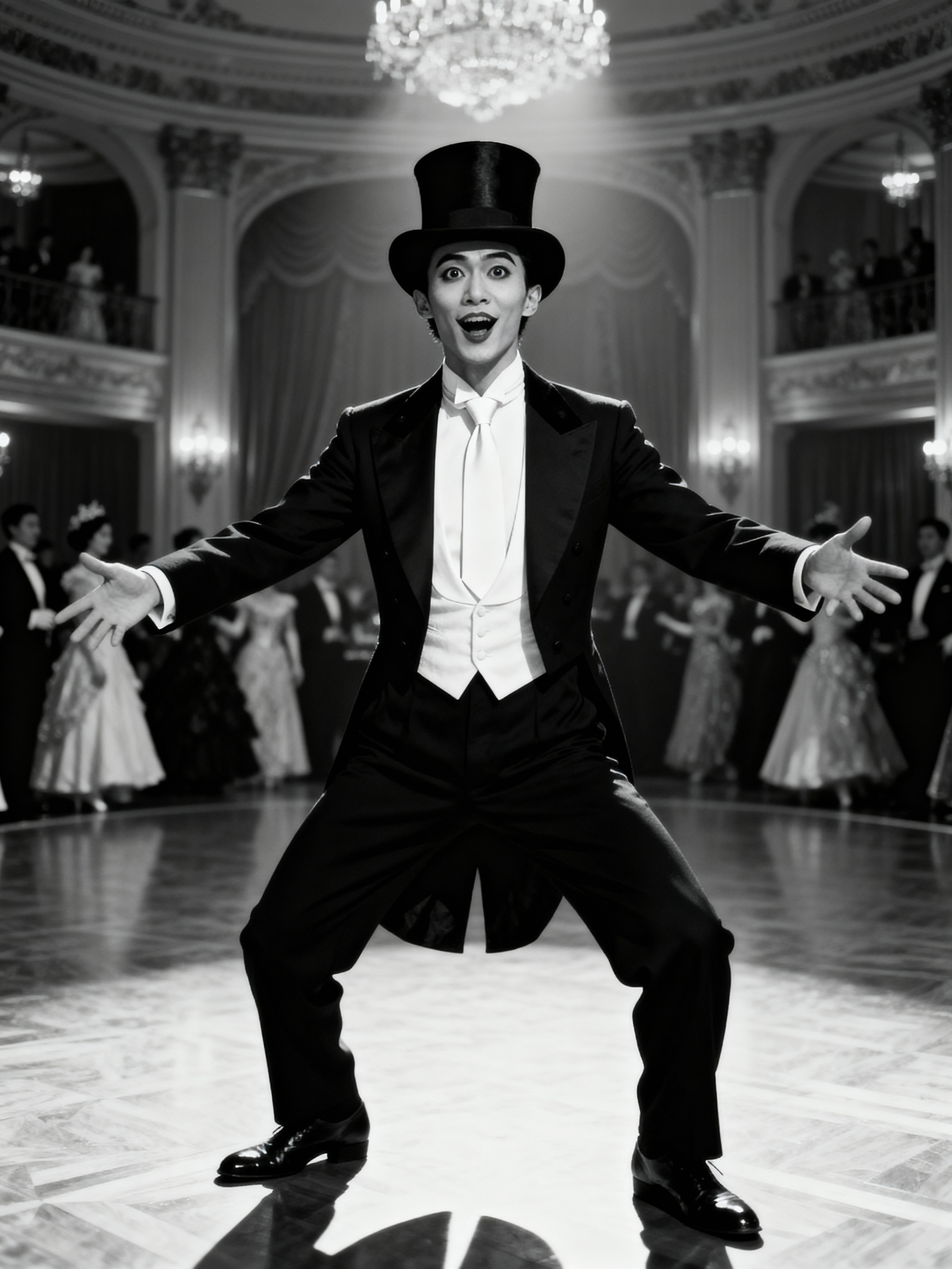 black and white 35mm film of model as a 1920s silent film gentleman at a grand ball, wearing a white tie formal suit with top hat, exaggerated haughty expression, theatrical pose, black and white with iris vignette effect, ballroom setting