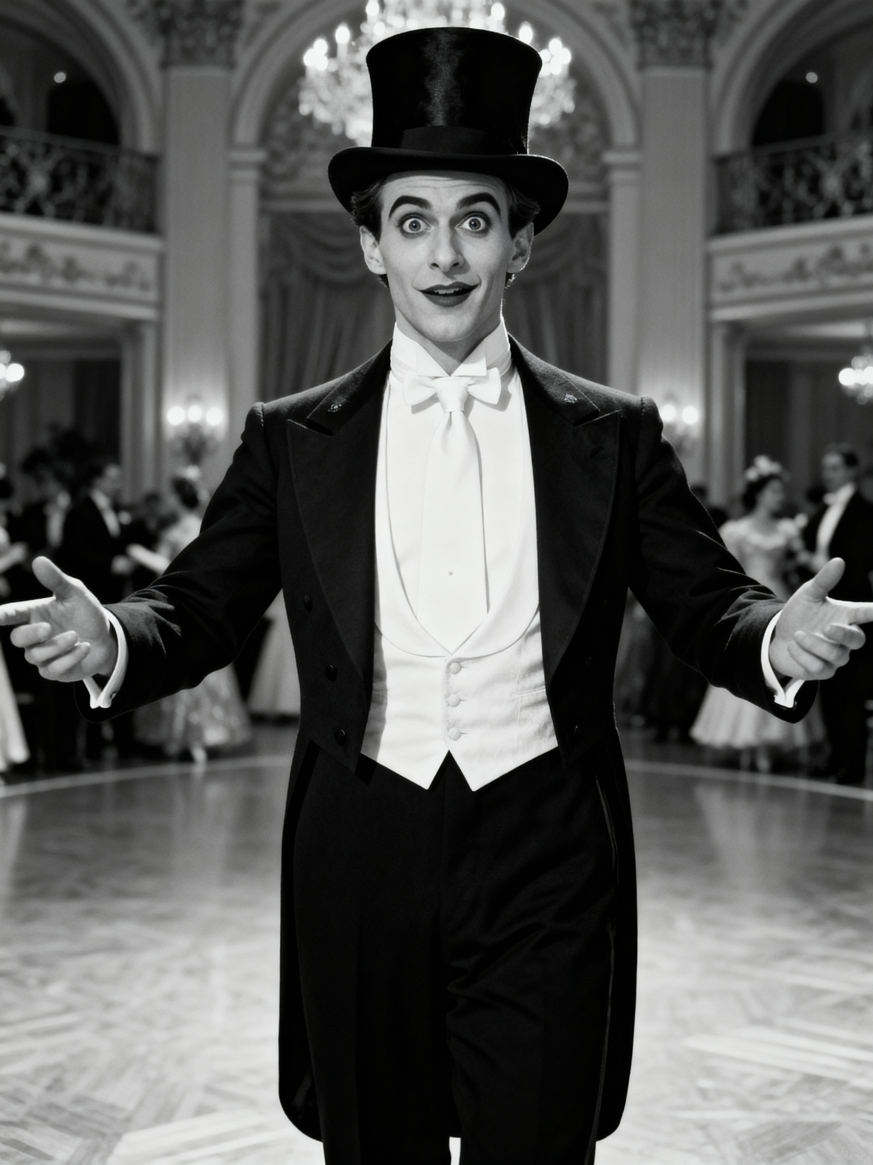 black and white 35mm film of model as a 1920s silent film gentleman at a grand ball, wearing a white tie formal suit with top hat, exaggerated haughty expression, theatrical pose, black and white with iris vignette effect, ballroom setting