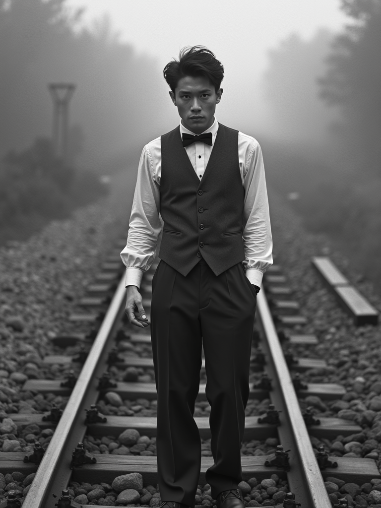 black and white 35mm film of model as a 1920s silent film hero on railroad tracks, wearing a period waistcoat and trousers, exaggerated fearful expression, melodramatic pose, vignette effect, black and white with silent film aesthetic, title card nearby