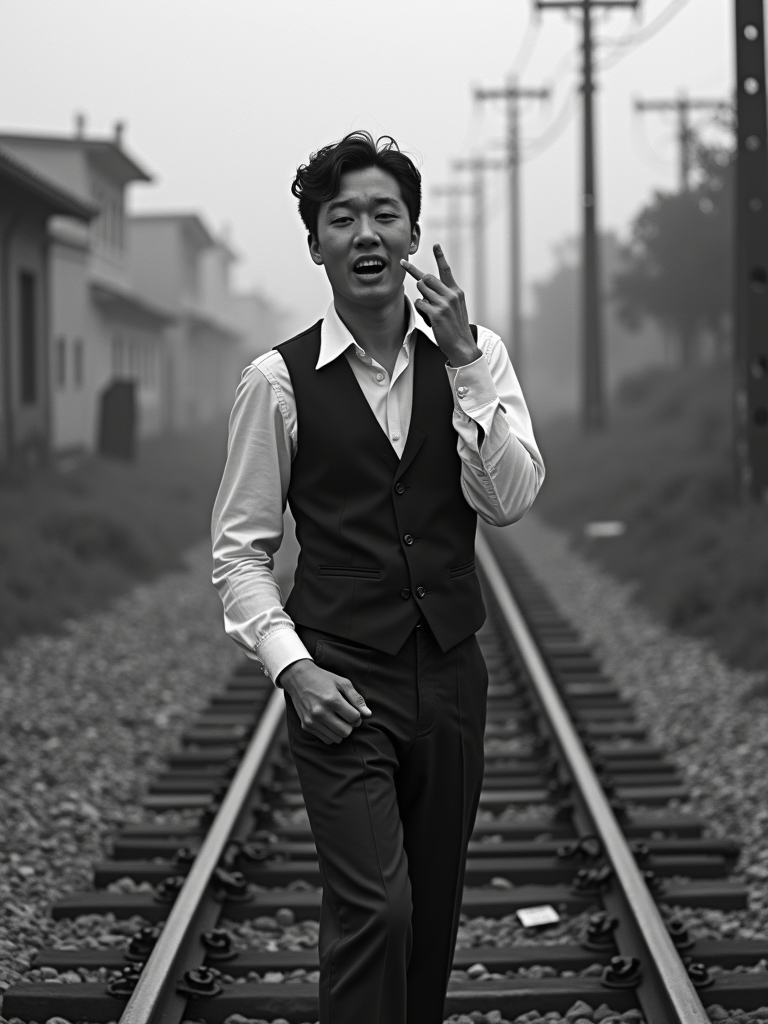 black and white 35mm film of model as a 1920s silent film hero on railroad tracks, wearing a period waistcoat and trousers, exaggerated fearful expression, melodramatic pose, vignette effect, black and white with silent film aesthetic, title card nearby