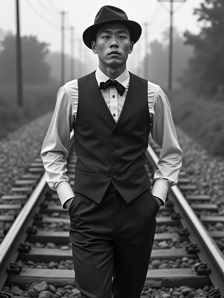black and white 35mm film of model as a 1920s silent film hero on railroad tracks, wearing a period waistcoat and trousers, exaggerated fearful expression, melodramatic pose, vignette effect, black and white with silent film aesthetic, title card nearby