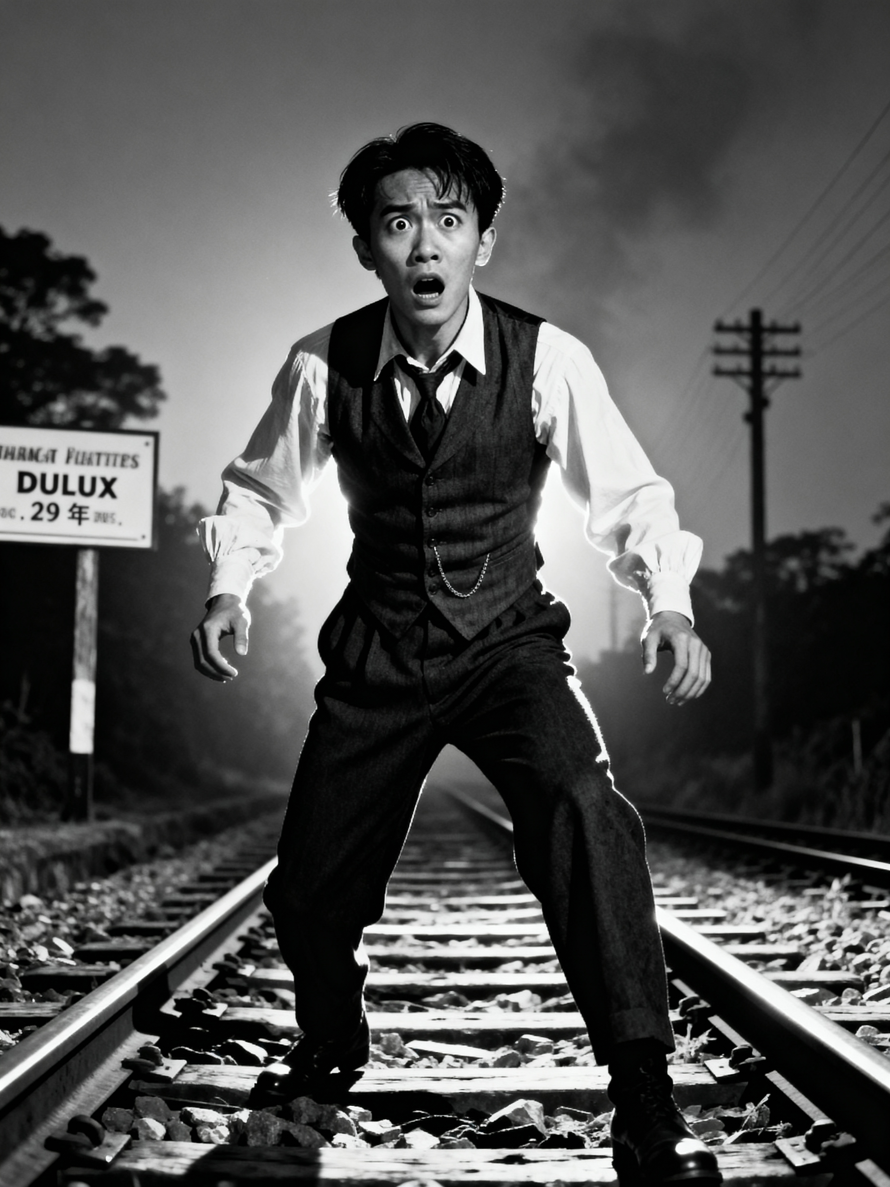 black and white 35mm film of model as a 1920s silent film hero on railroad tracks, wearing a period waistcoat and trousers, exaggerated fearful expression, melodramatic pose, vignette effect, black and white with silent film aesthetic, title card nearby