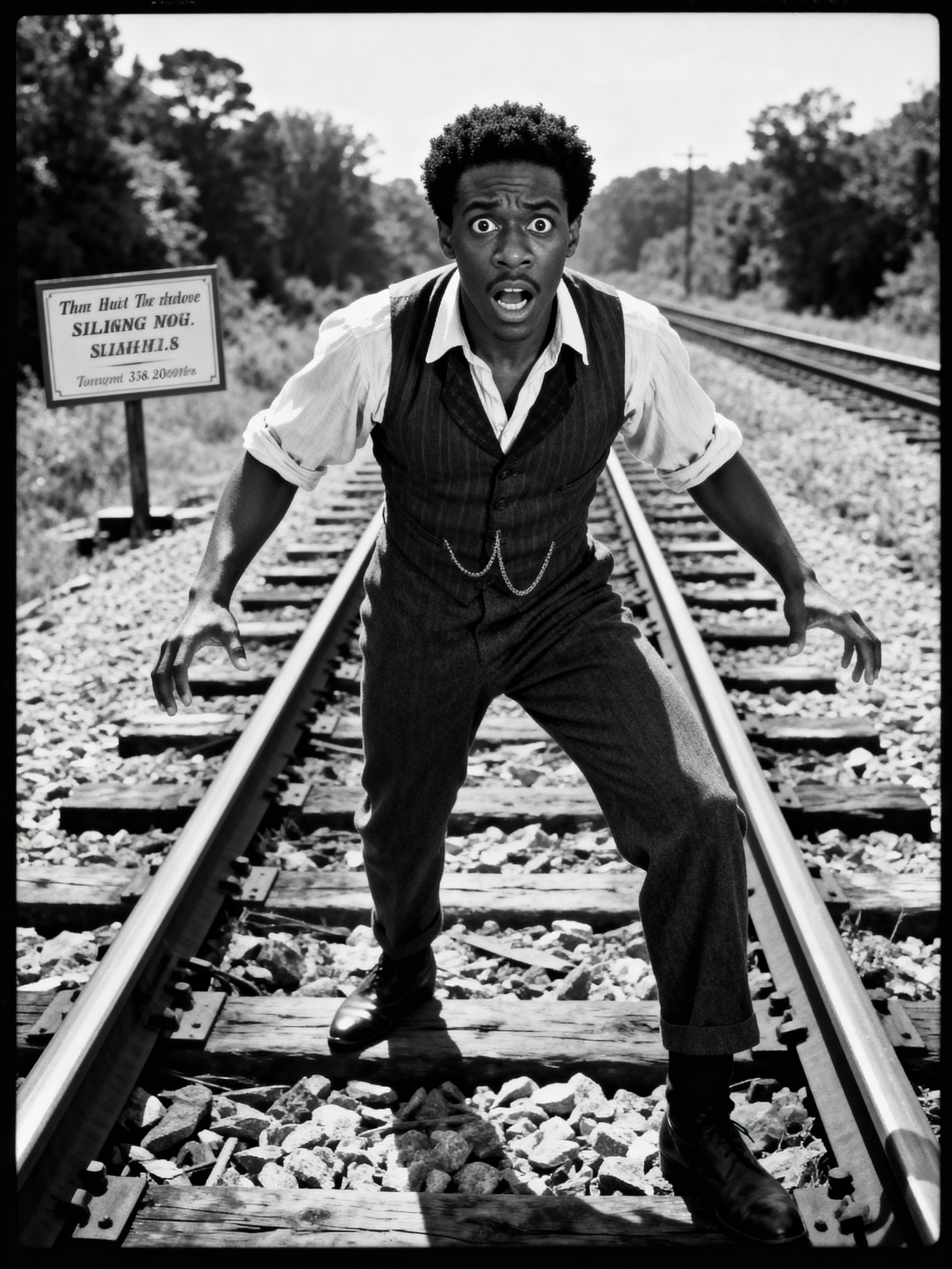 black and white 35mm film of model as a 1920s silent film hero on railroad tracks, wearing a period waistcoat and trousers, exaggerated fearful expression, melodramatic pose, vignette effect, black and white with silent film aesthetic, title card nearby