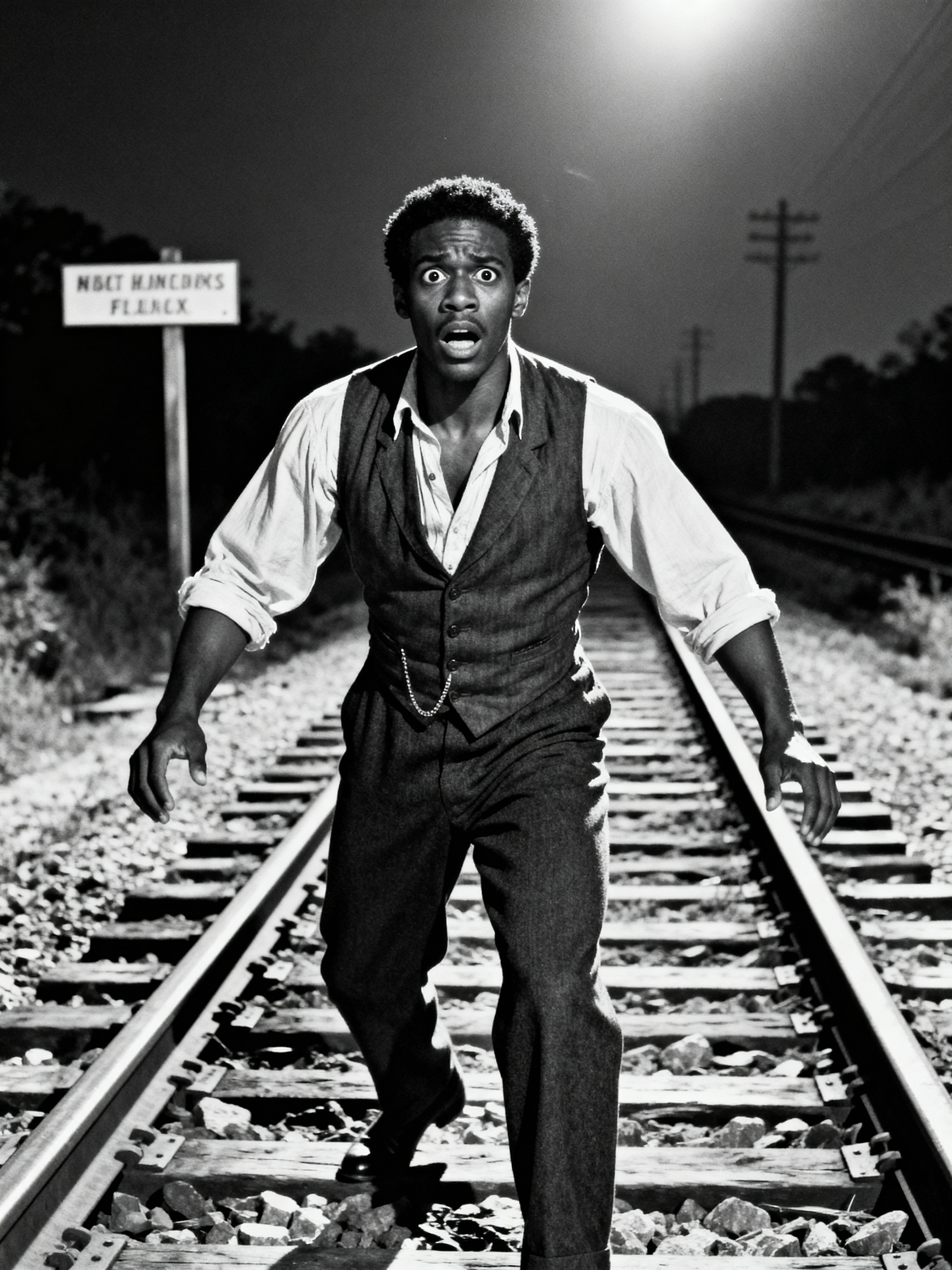 black and white 35mm film of model as a 1920s silent film hero on railroad tracks, wearing a period waistcoat and trousers, exaggerated fearful expression, melodramatic pose, vignette effect, black and white with silent film aesthetic, title card nearby