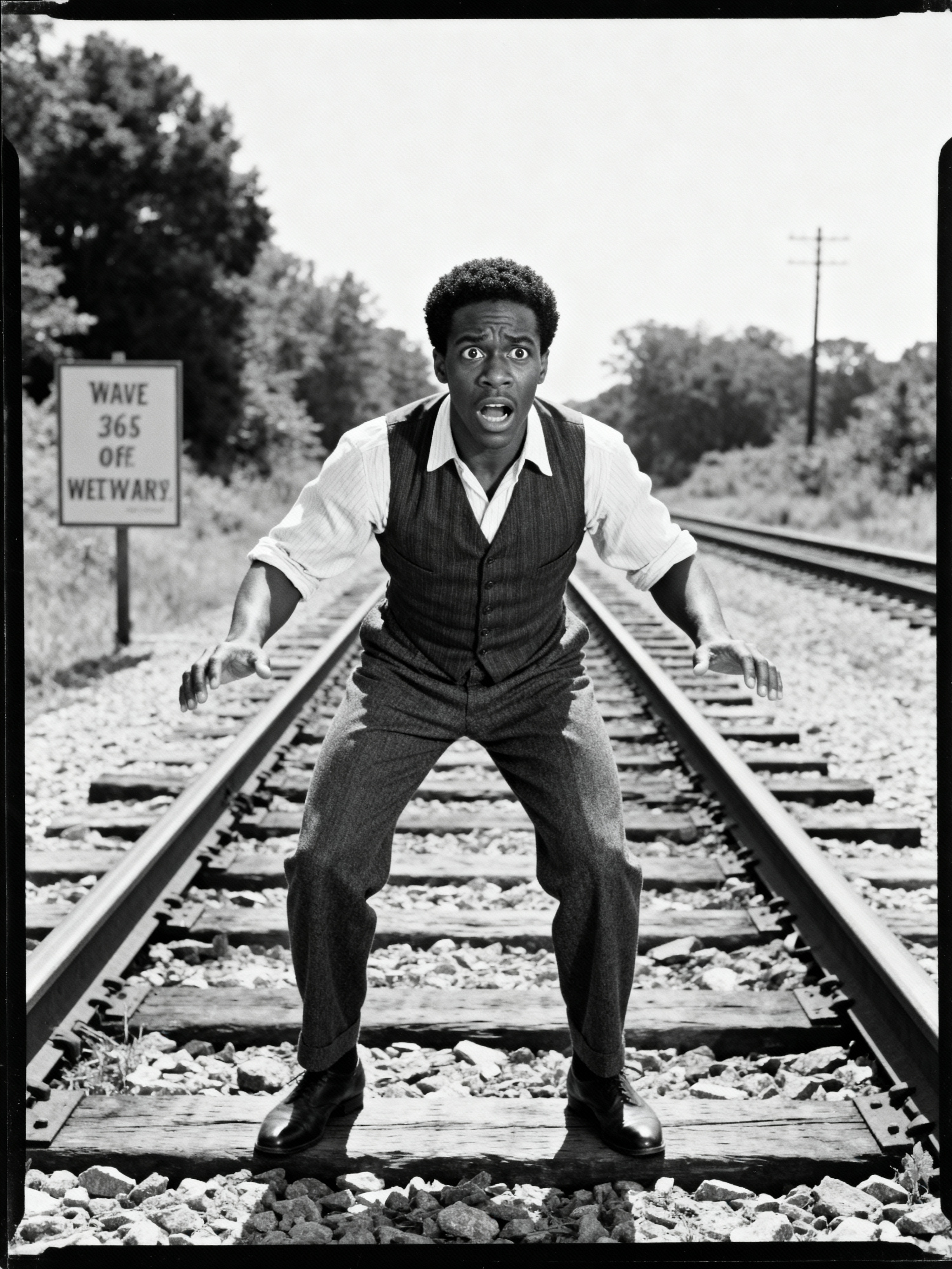 black and white 35mm film of model as a 1920s silent film hero on railroad tracks, wearing a period waistcoat and trousers, exaggerated fearful expression, melodramatic pose, vignette effect, black and white with silent film aesthetic, title card nearby