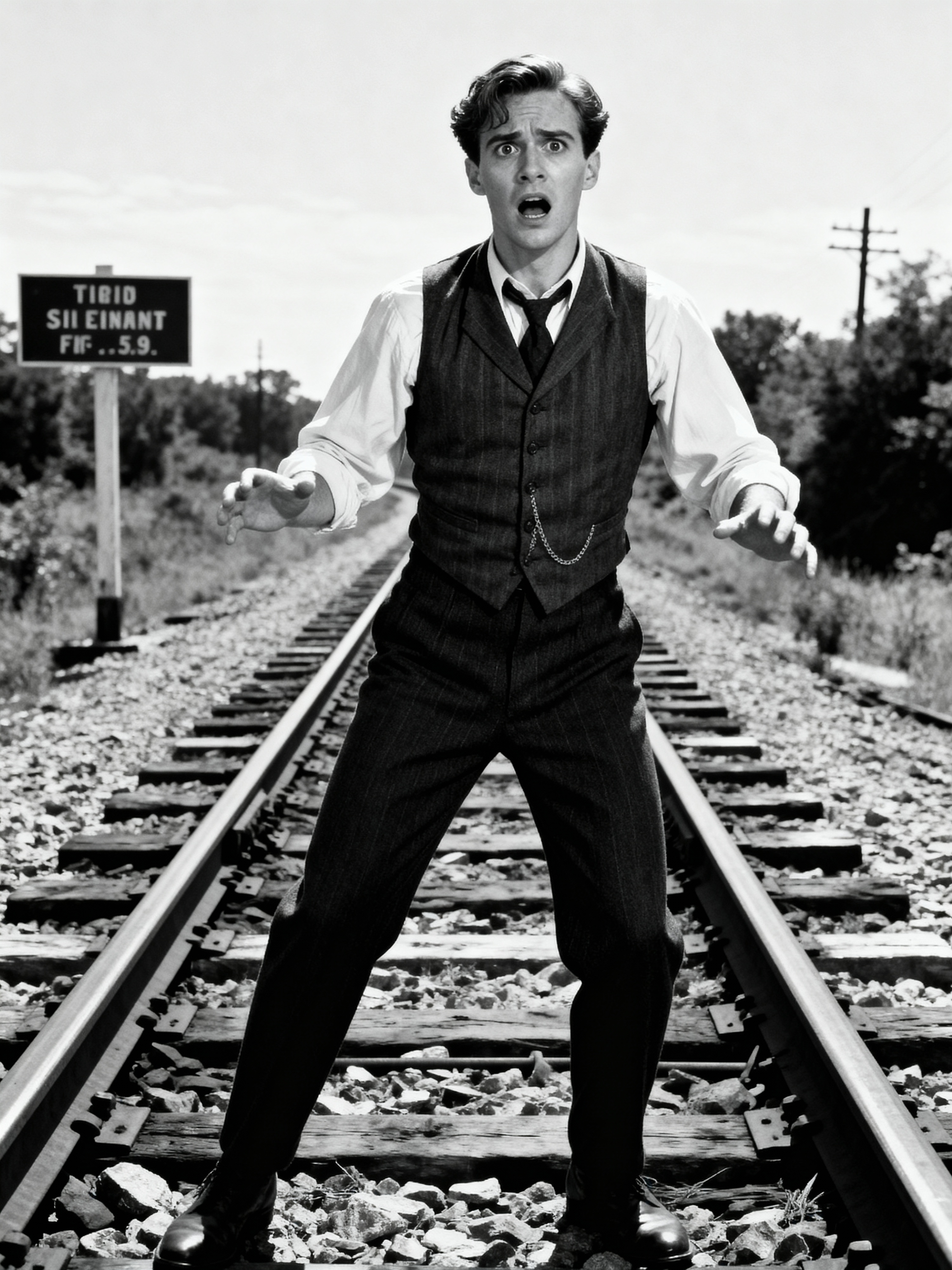 black and white 35mm film of model as a 1920s silent film hero on railroad tracks, wearing a period waistcoat and trousers, exaggerated fearful expression, melodramatic pose, vignette effect, black and white with silent film aesthetic, title card nearby
