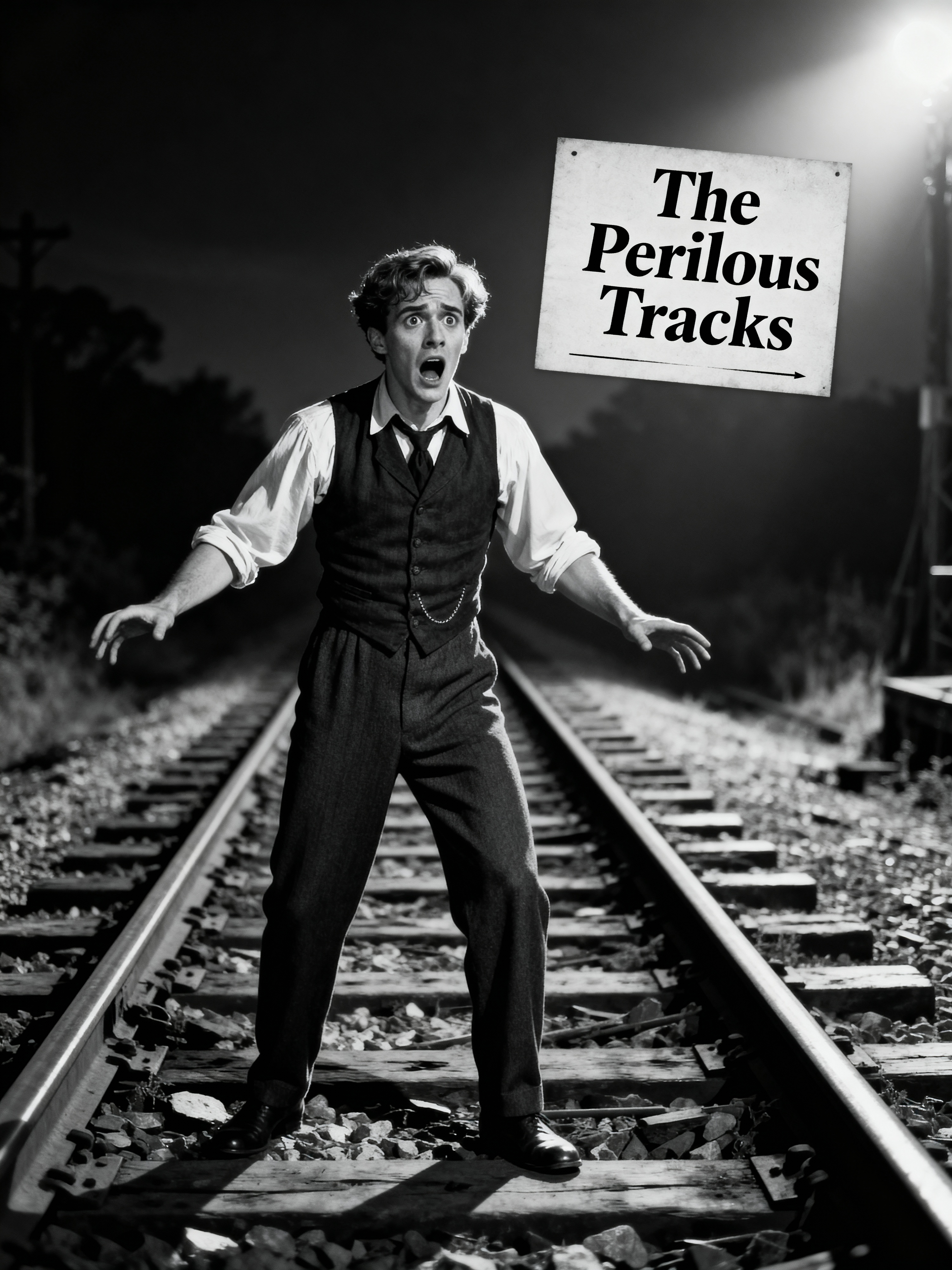 black and white 35mm film of model as a 1920s silent film hero on railroad tracks, wearing a period waistcoat and trousers, exaggerated fearful expression, melodramatic pose, vignette effect, black and white with silent film aesthetic, title card nearby