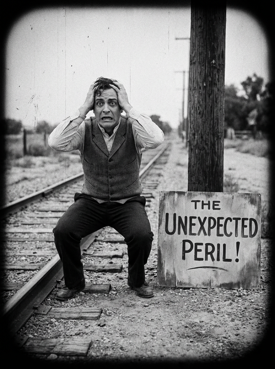 black and white 35mm film of model as a 1920s silent film hero on railroad tracks, wearing a period waistcoat and trousers, exaggerated fearful expression, melodramatic pose, vignette effect, black and white with silent film aesthetic, title card nearby