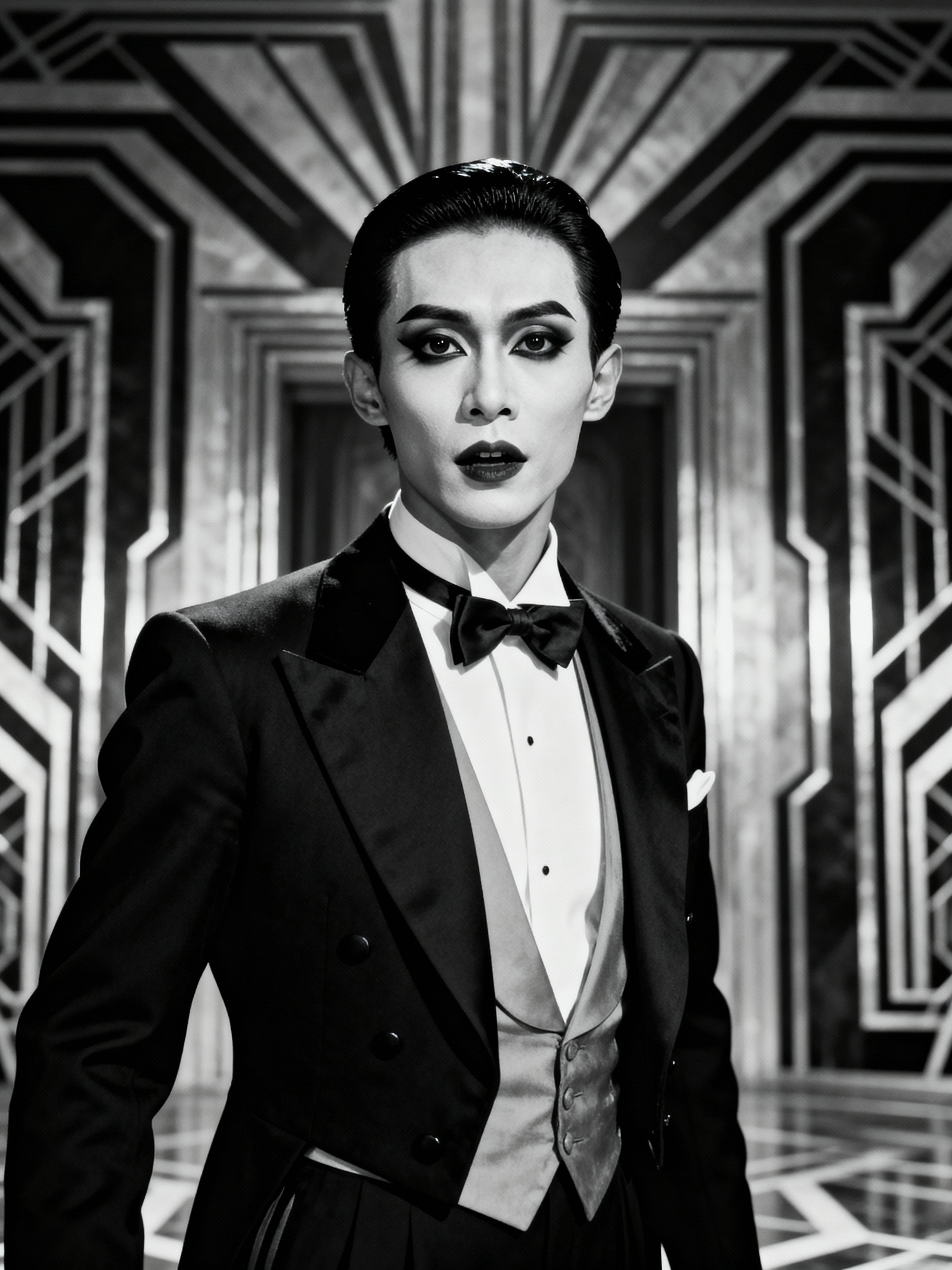 black and white 35mm film of model as a 1920s silent film leading model with exaggerated dramatic expression, wearing a formal suit with bow tie, dramatic makeup with pale face and darkened eyes, high-contrast black and white photography, vintage film grain, art deco set design