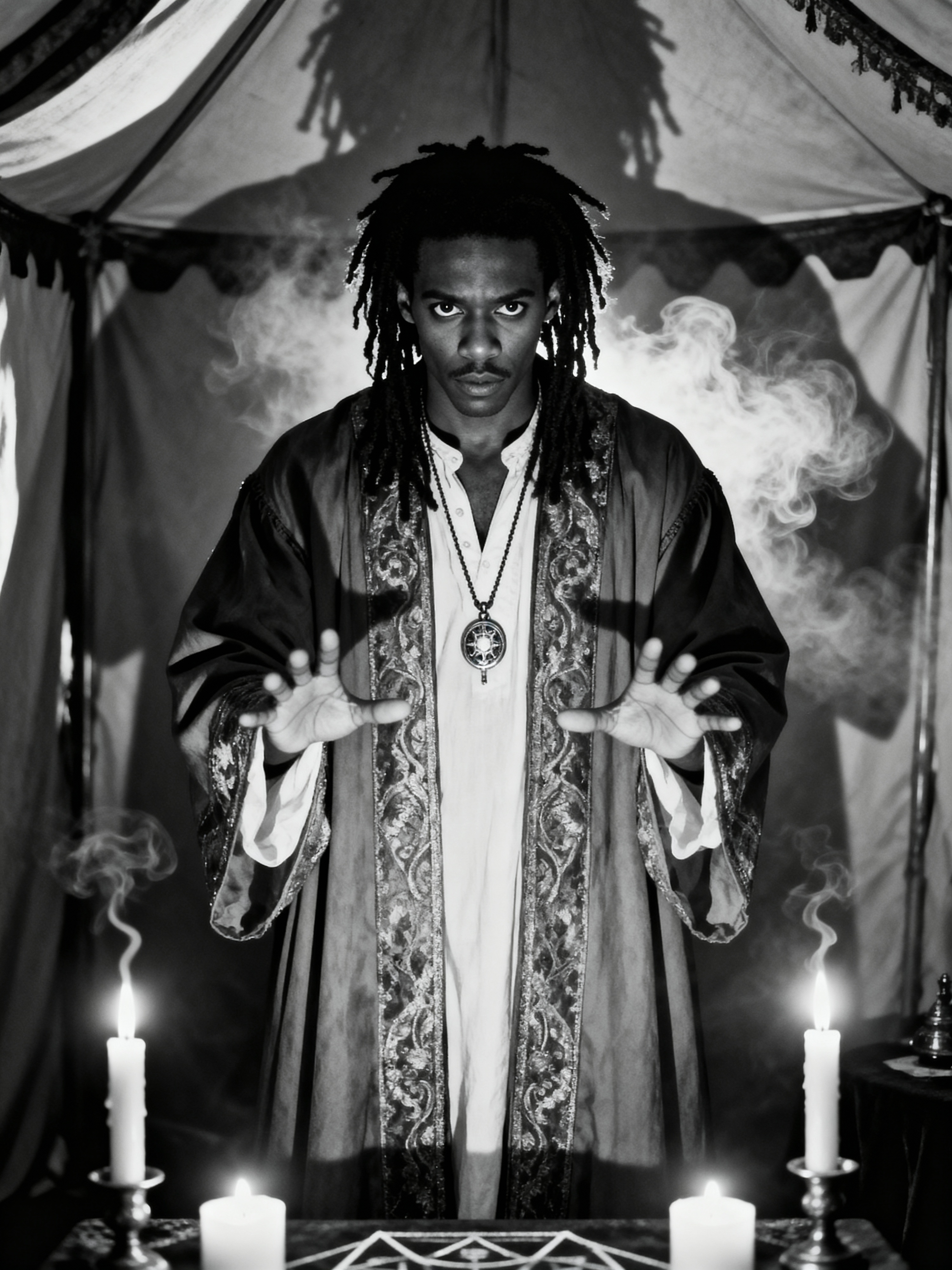 black and white 35mm film of model as a 1920s silent film mystic performing a séance, wearing ornate robes with amulet, intense hypnotic stare, candles creating dramatic shadows, black and white with smoky vignette effect, fortune teller's tent setting