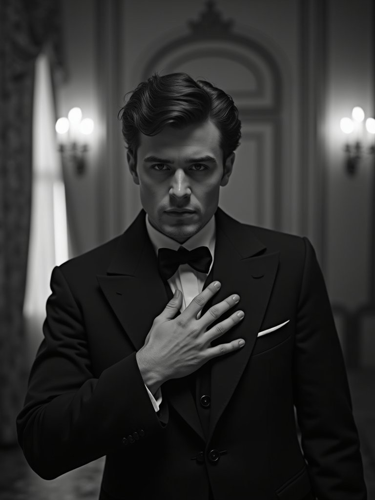 black and white 35mm film of model as a 1920s silent film nobleman in distress, wearing a Victorian suit with cravat, reacting dramatically with hand to chest, theatrical staging, black and white with flickering film effect, opulent mansion interior