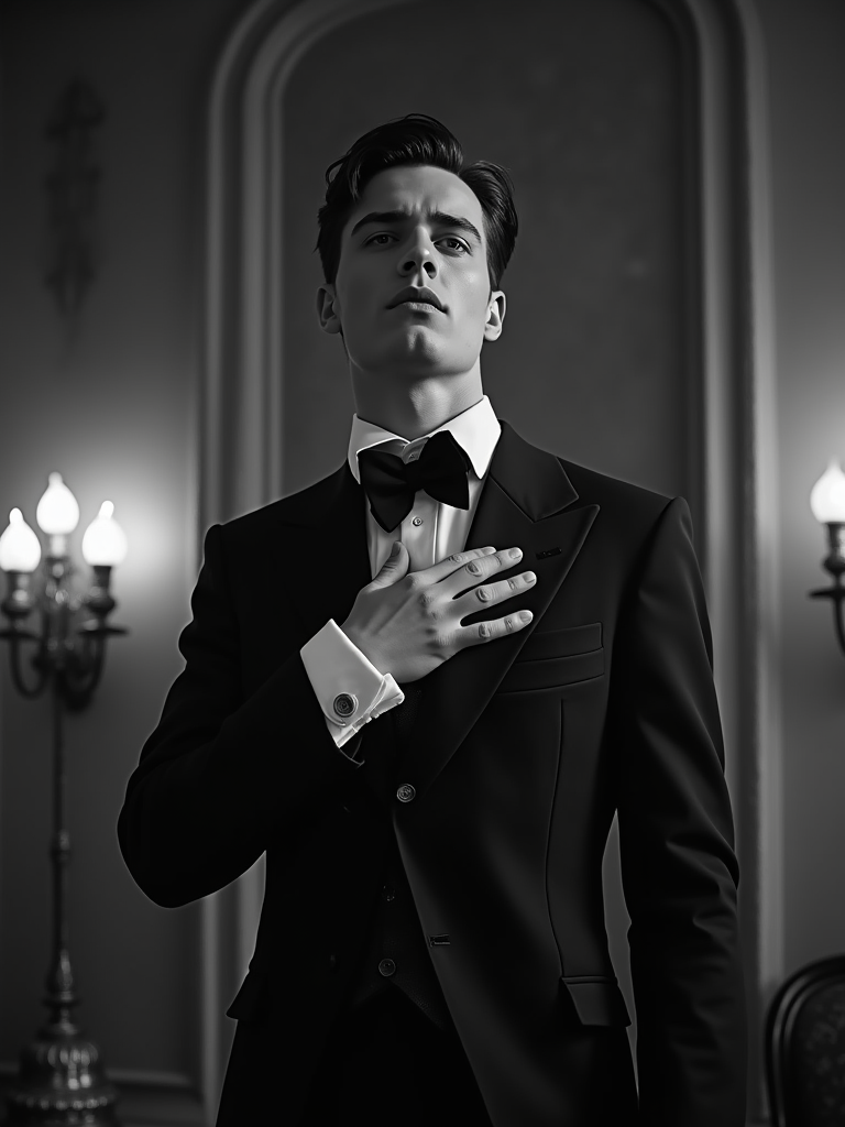 black and white 35mm film of model as a 1920s silent film nobleman in distress, wearing a Victorian suit with cravat, reacting dramatically with hand to chest, theatrical staging, black and white with flickering film effect, opulent mansion interior