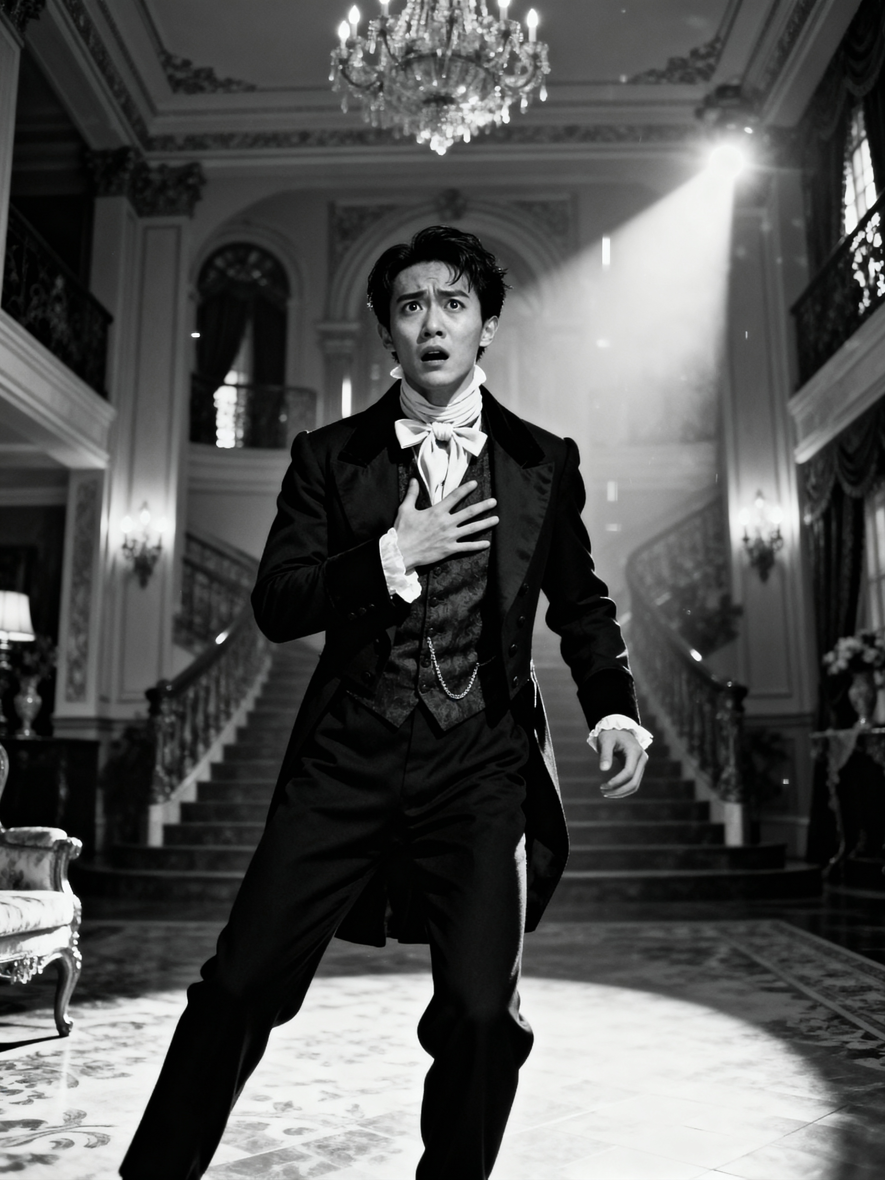 black and white 35mm film of model as a 1920s silent film nobleman in distress, wearing a Victorian suit with cravat, reacting dramatically with hand to chest, theatrical staging, black and white with flickering film effect, opulent mansion interior