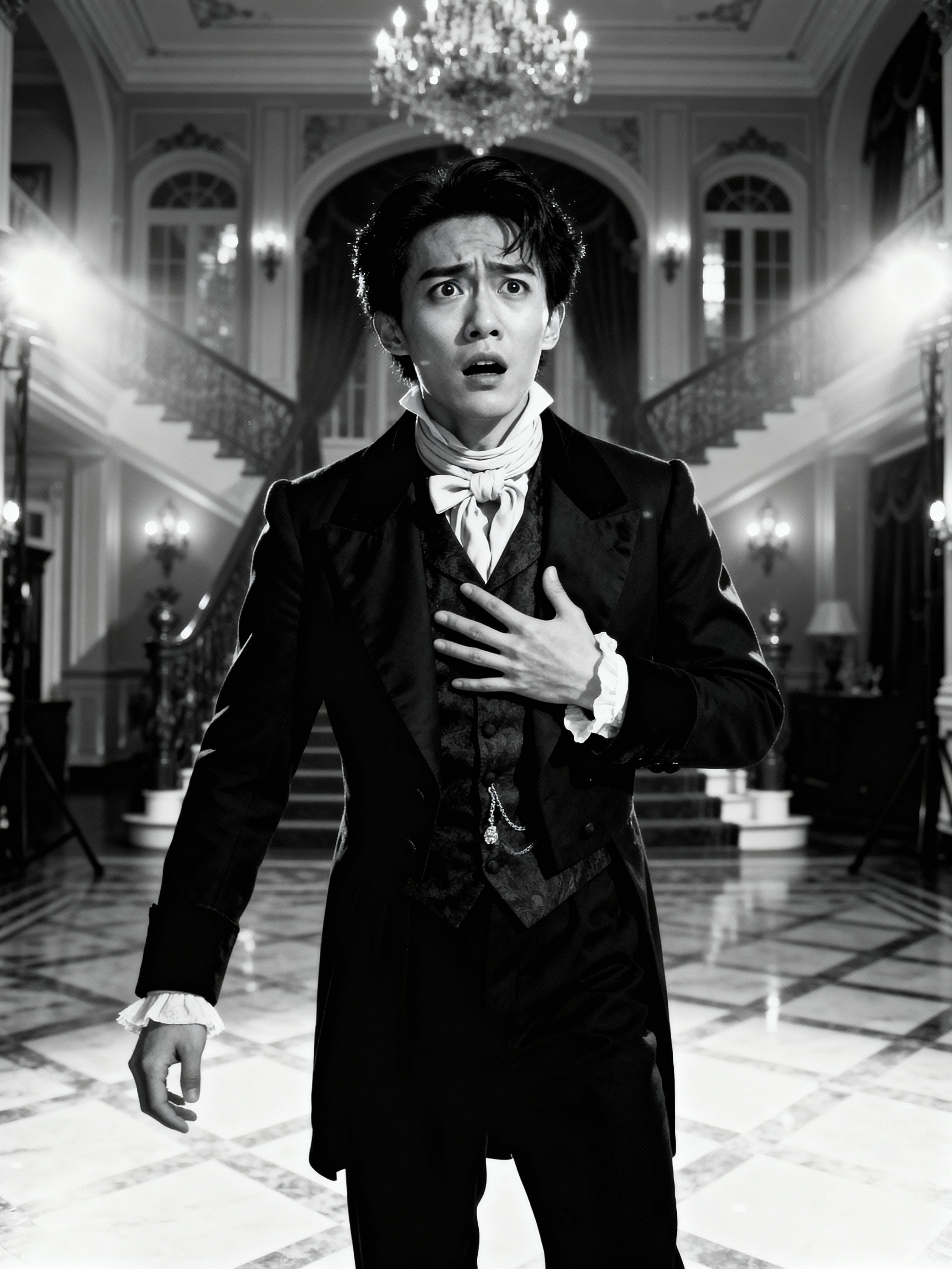 black and white 35mm film of model as a 1920s silent film nobleman in distress, wearing a Victorian suit with cravat, reacting dramatically with hand to chest, theatrical staging, black and white with flickering film effect, opulent mansion interior