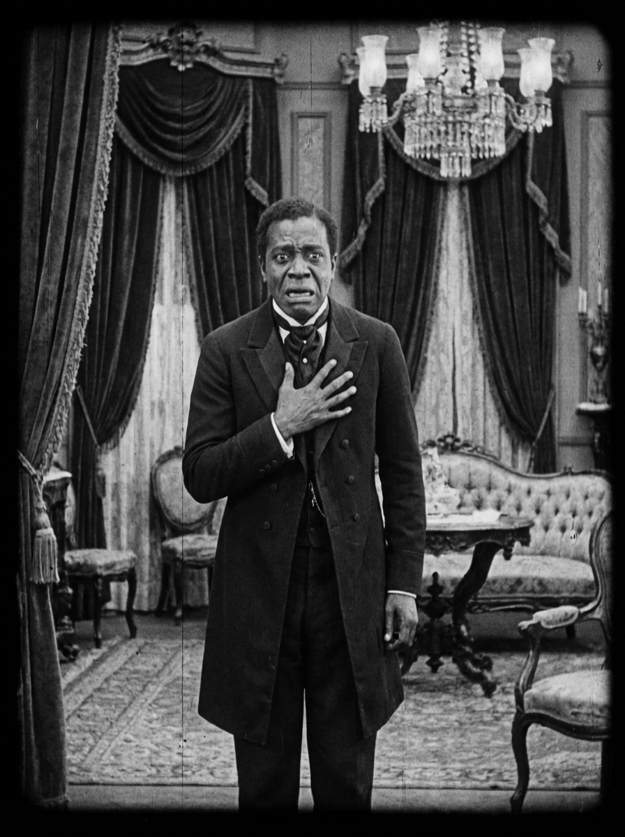 black and white 35mm film of model as a 1920s silent film nobleman in distress, wearing a Victorian suit with cravat, reacting dramatically with hand to chest, theatrical staging, black and white with flickering film effect, opulent mansion interior