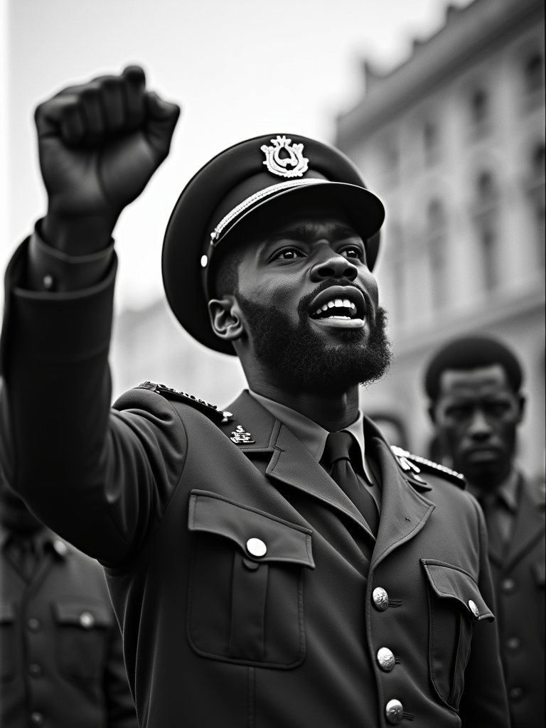 black and white 35mm film of model as a 1920s silent film revolutionary leader addressing a crowd, wearing a military uniform with cap, passionate expression with raised fist, dramatic low angle shot, black and white with vintage film grain, propaganda poster aesthetic