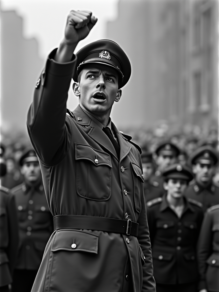 black and white 35mm film of model as a 1920s silent film revolutionary leader addressing a crowd, wearing a military uniform with cap, passionate expression with raised fist, dramatic low angle shot, black and white with vintage film grain, propaganda poster aesthetic