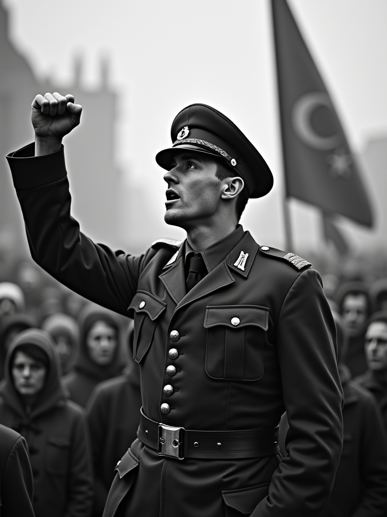black and white 35mm film of model as a 1920s silent film revolutionary leader addressing a crowd, wearing a military uniform with cap, passionate expression with raised fist, dramatic low angle shot, black and white with vintage film grain, propaganda poster aesthetic