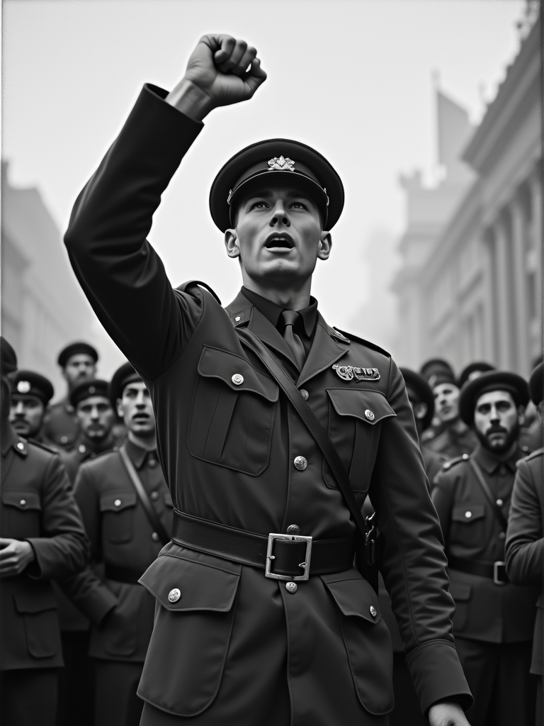 black and white 35mm film of model as a 1920s silent film revolutionary leader addressing a crowd, wearing a military uniform with cap, passionate expression with raised fist, dramatic low angle shot, black and white with vintage film grain, propaganda poster aesthetic