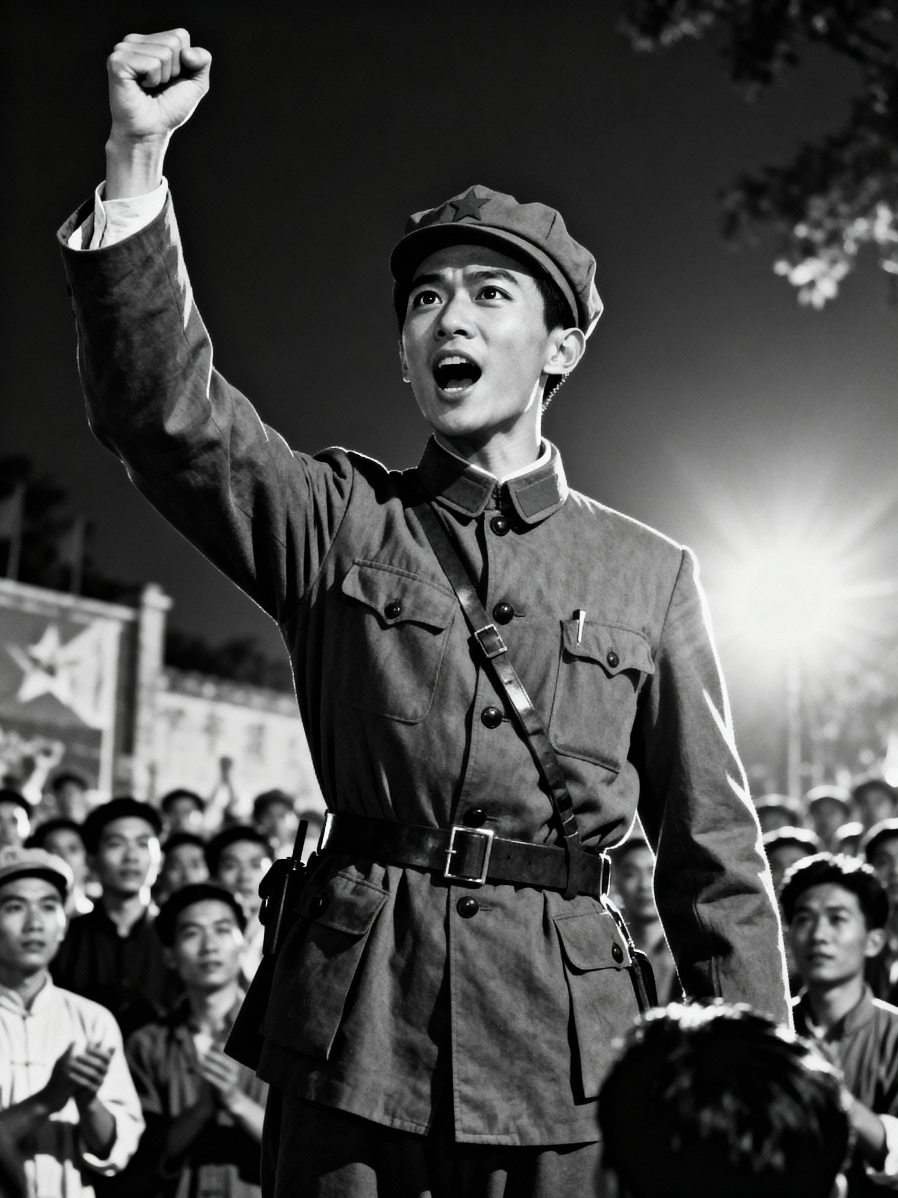 black and white 35mm film of model as a 1920s silent film revolutionary leader addressing a crowd, wearing a military uniform with cap, passionate expression with raised fist, dramatic low angle shot, black and white with vintage film grain, propaganda poster aesthetic