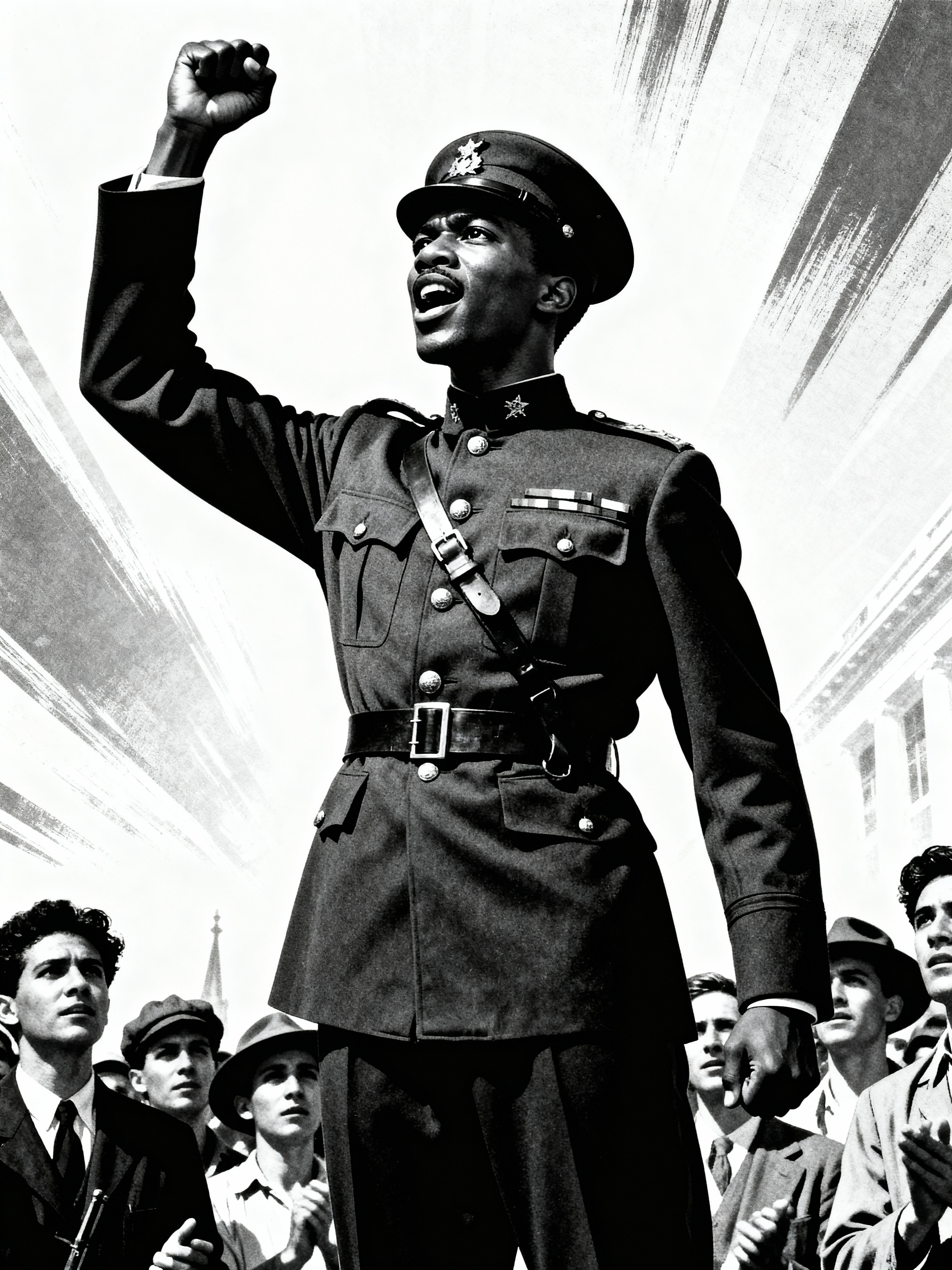 black and white 35mm film of model as a 1920s silent film revolutionary leader addressing a crowd, wearing a military uniform with cap, passionate expression with raised fist, dramatic low angle shot, black and white with vintage film grain, propaganda poster aesthetic