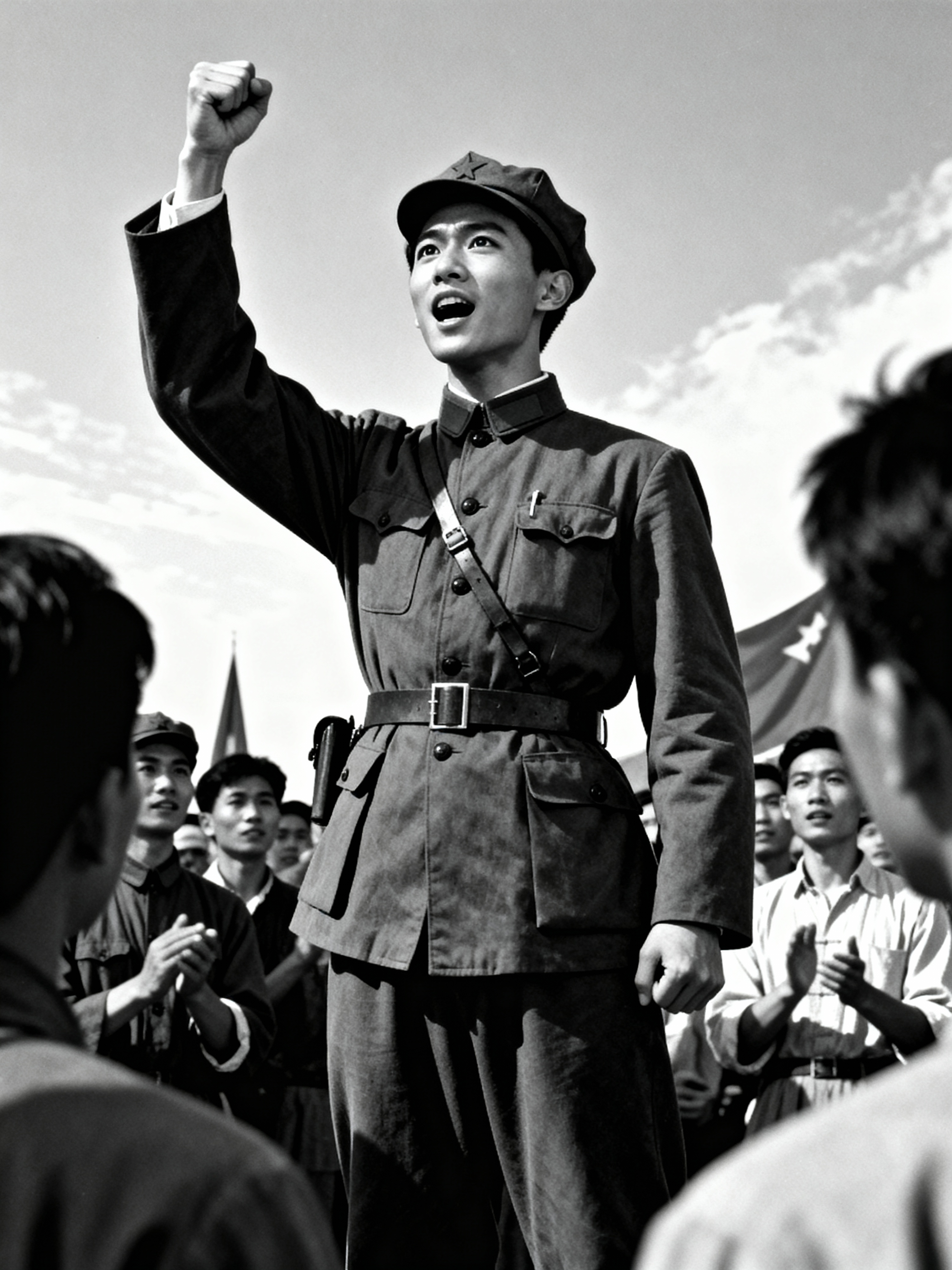 black and white 35mm film of model as a 1920s silent film revolutionary leader addressing a crowd, wearing a military uniform with cap, passionate expression with raised fist, dramatic low angle shot, black and white with vintage film grain, propaganda poster aesthetic