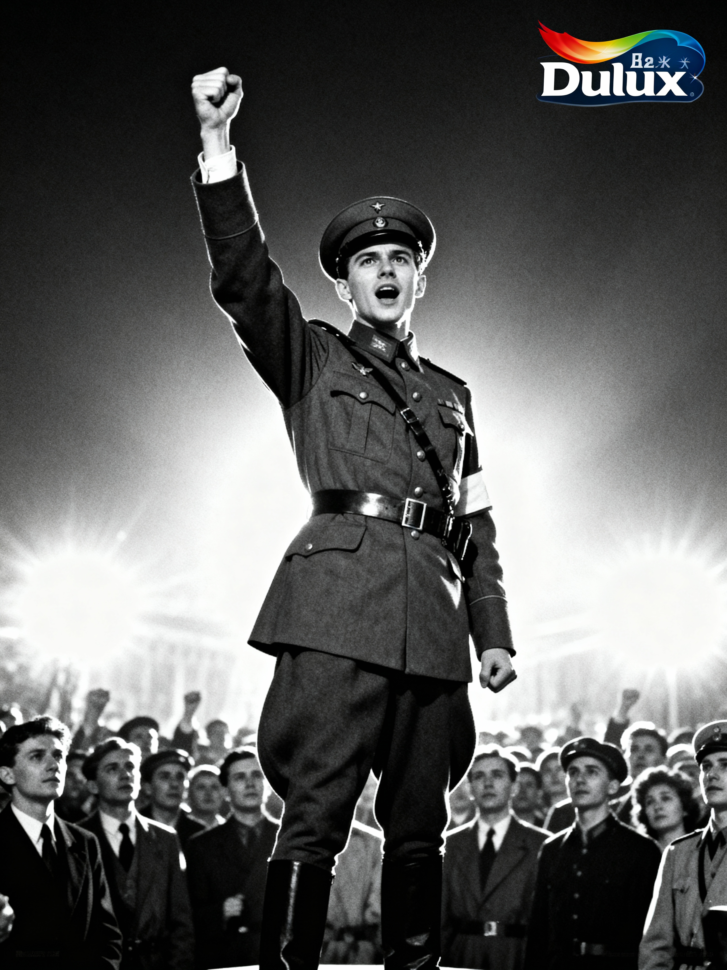 black and white 35mm film of model as a 1920s silent film revolutionary leader addressing a crowd, wearing a military uniform with cap, passionate expression with raised fist, dramatic low angle shot, black and white with vintage film grain, propaganda poster aesthetic