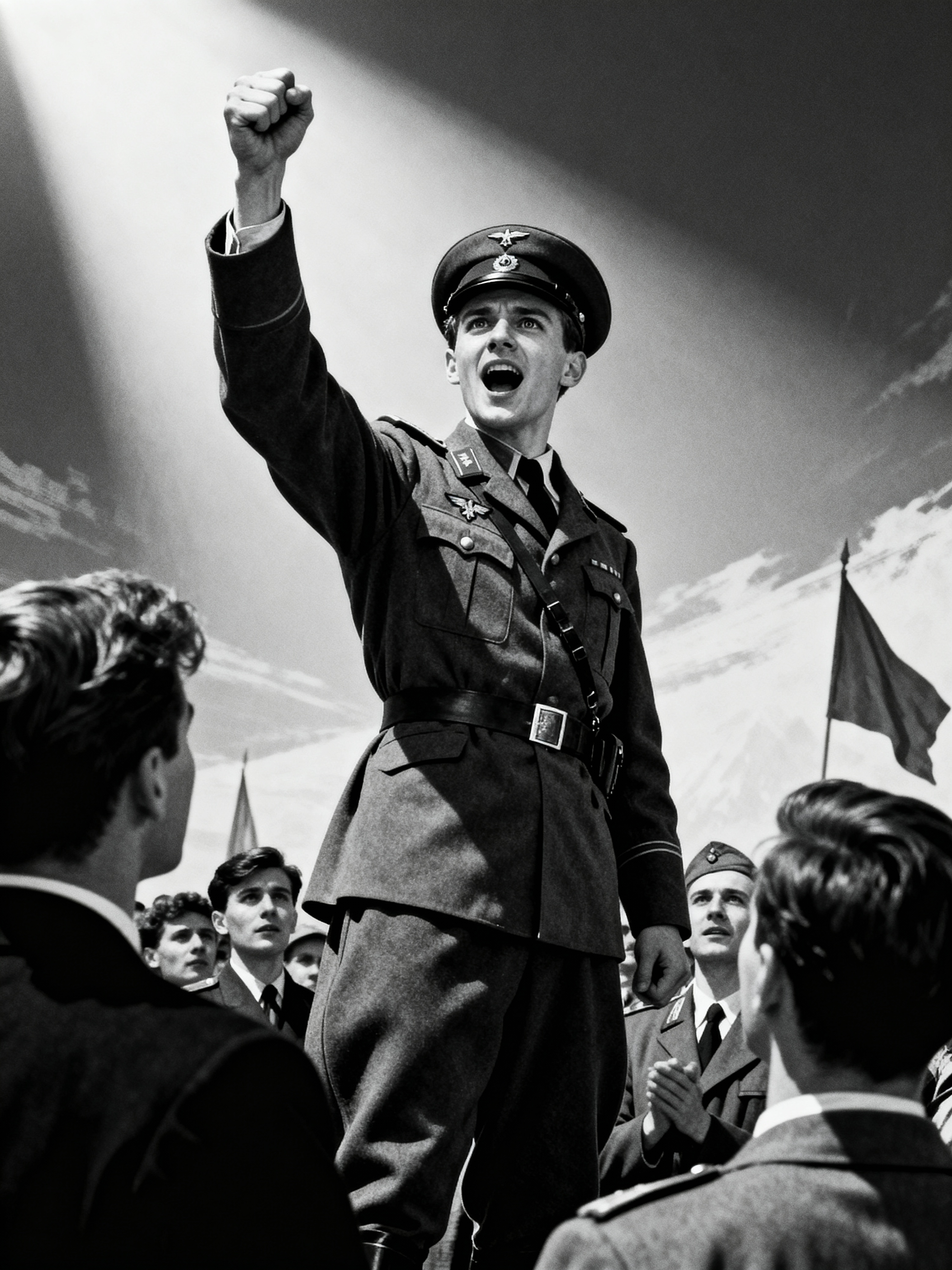 black and white 35mm film of model as a 1920s silent film revolutionary leader addressing a crowd, wearing a military uniform with cap, passionate expression with raised fist, dramatic low angle shot, black and white with vintage film grain, propaganda poster aesthetic